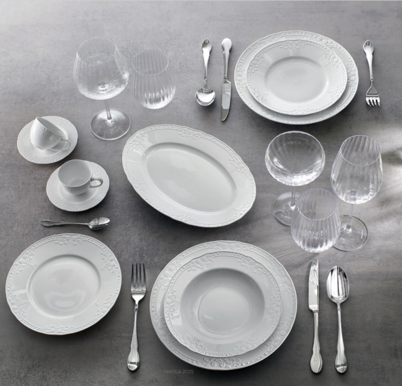 Cu linii fine si elegante ce amintesc de rafinatele intarsii ale artelor de odinioara, colectia Ricordi este un omagiu adus frumusetii clasice. Intr-un alb pur, realizate dintr-un portelan new bone stralucitoar, piesele din aceasta colectie transforma orice masa intr-o adevarata scena regala, unde eleganta se face simtita in fiecare detaliu.