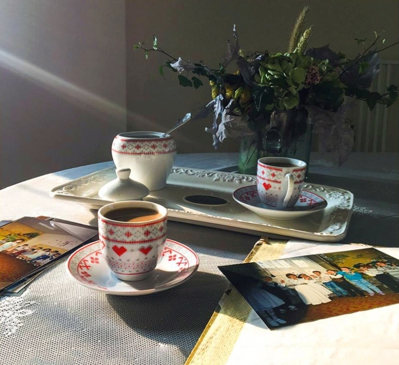 2 cesti de cafea (80 ml), 2 farfurii si 1 zaharnita cu capac