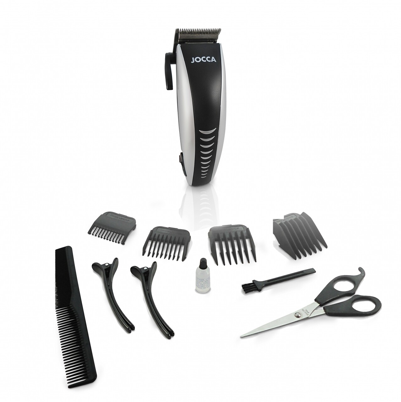 o mașină de tuns cu lame de oțel, 4 capete de tăiere, 1 pieptene, 2 clești, 1 perie, 1 foarfecă și 1 ulei pentru ungerea aparatului