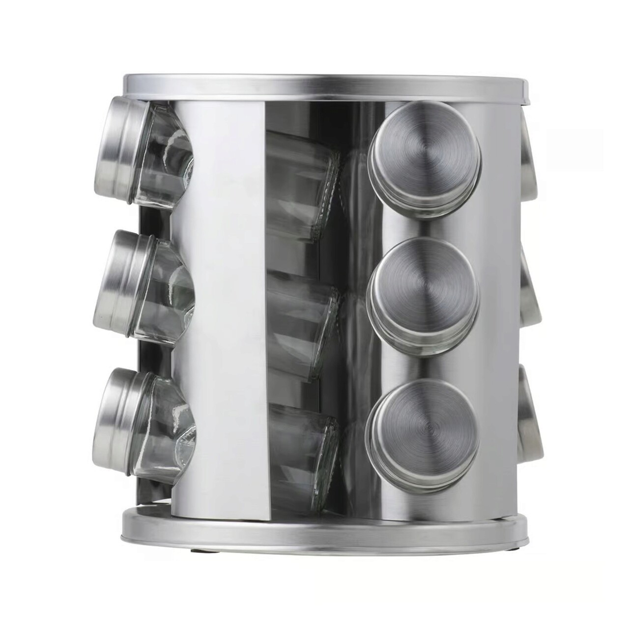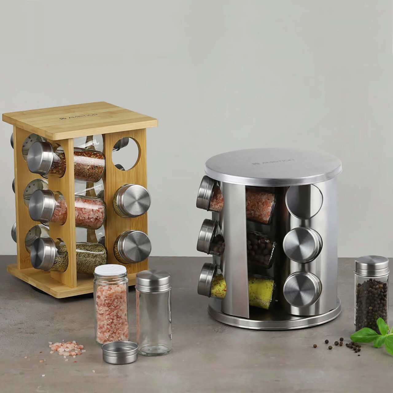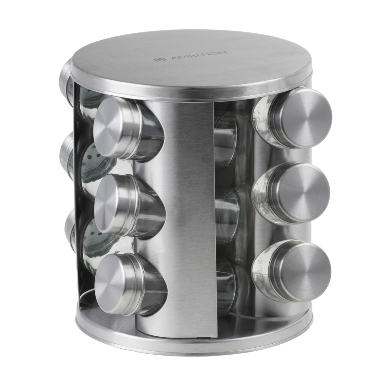 Set 12 recipiente pentru condimente cu suport Cleo, Ambition, 17.5x17.5x19.5 cm, inox/sticla, argintiu/transparent