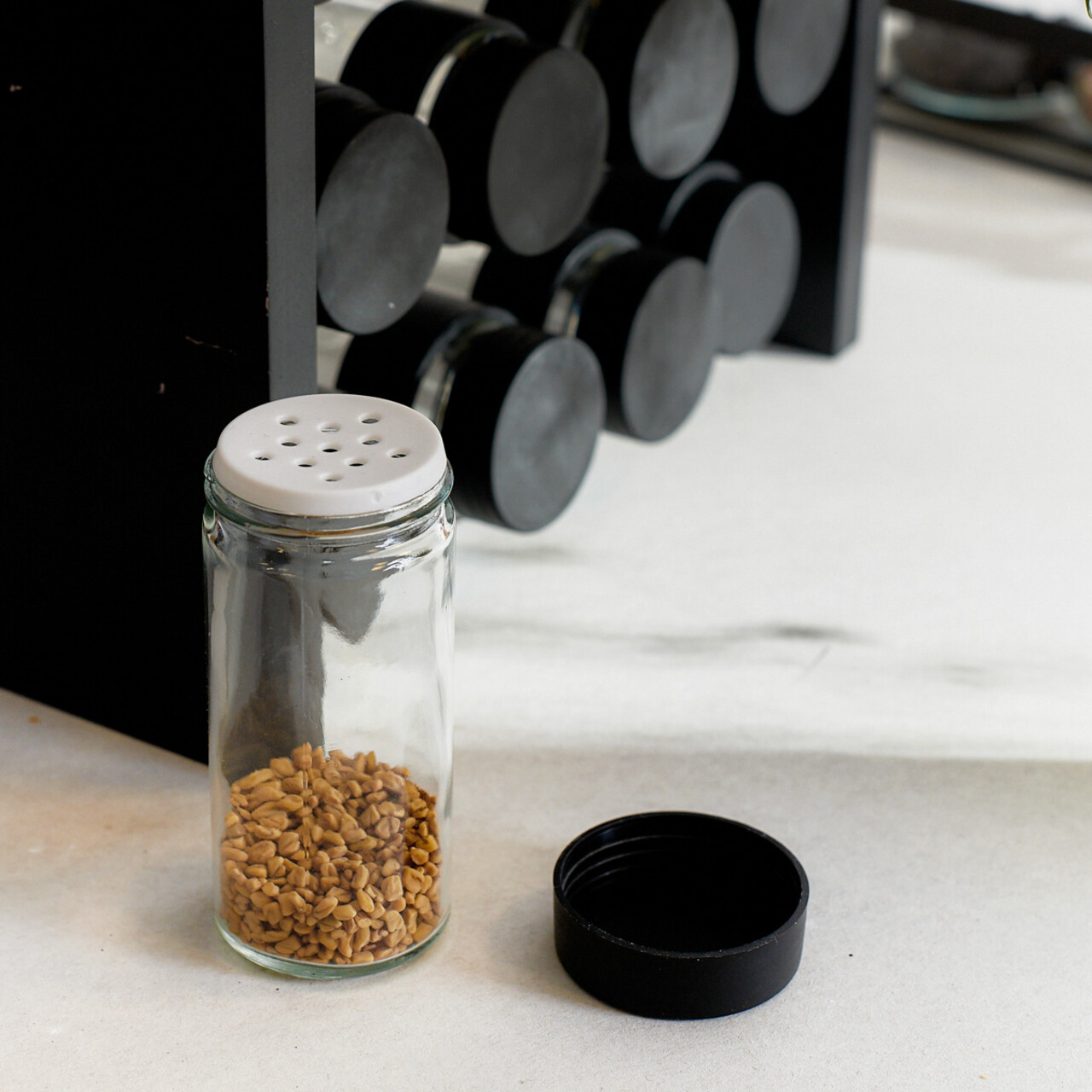 Set 12 recipiente pentru condimente si suport, Otto, Homla, 26x10x21 cm, MDF/sticla/plastic, negru/transparent