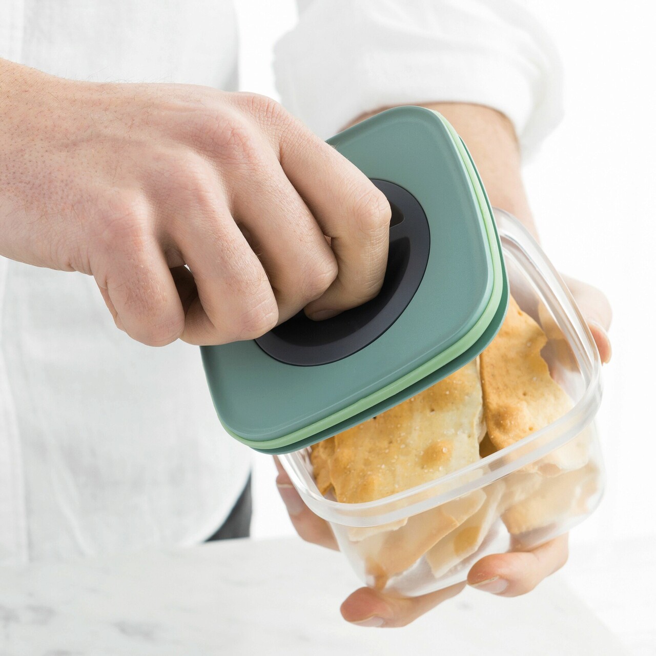 Pastrati biscuitii, bastoanele de morcov, muesli etc. proaspete cu o simpla rasucire? Nicio problema cand aveti la indemana aceste recipiente cu etansare inteligenta! Recipientele de 0,4 l si 1,0 l va permit sa pastrati diferite tipuri si cantitati de alimente proaspete, cu un capac care se blocheaza in pozitie cu o singura rasucire a cadranului one-touch. Acest lucru creeaza o inchidere etansa, astfel incat sa puteti pastra prospetimea mancarii si sa va organizati camara cu containere elegante stivuibile, care sa va inveseleasca bucataria ani la rand. Compozitie material: corp din plastic AS, capac din polipropilena, inel capac din silicon.