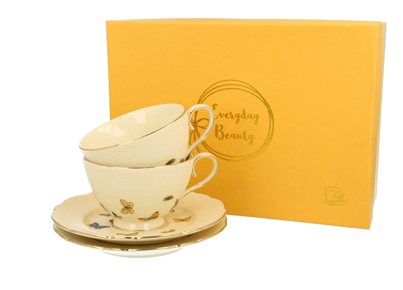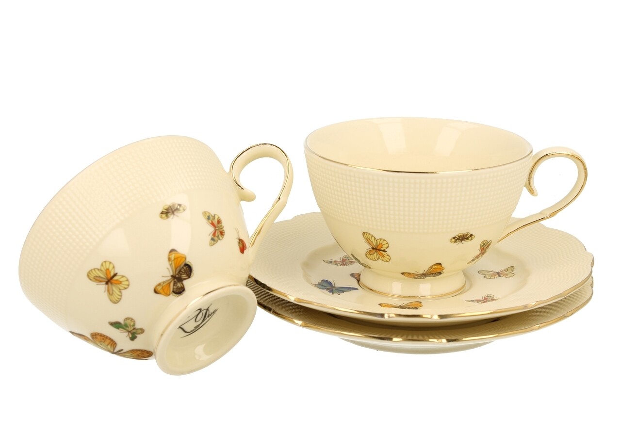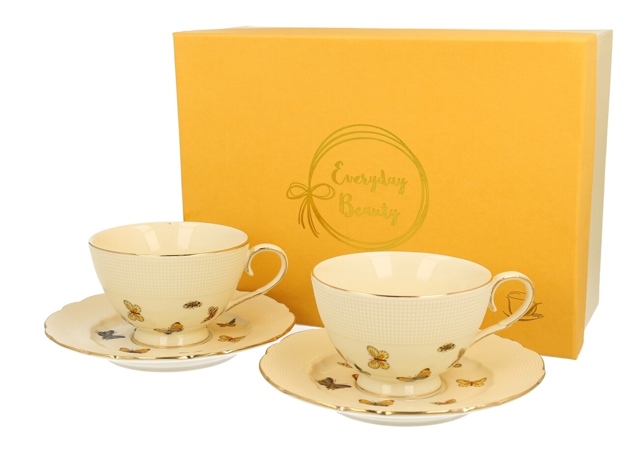 Set 2 cesti cu farfurie Butterfly, Duo, 260 ml, portelan, multicolor