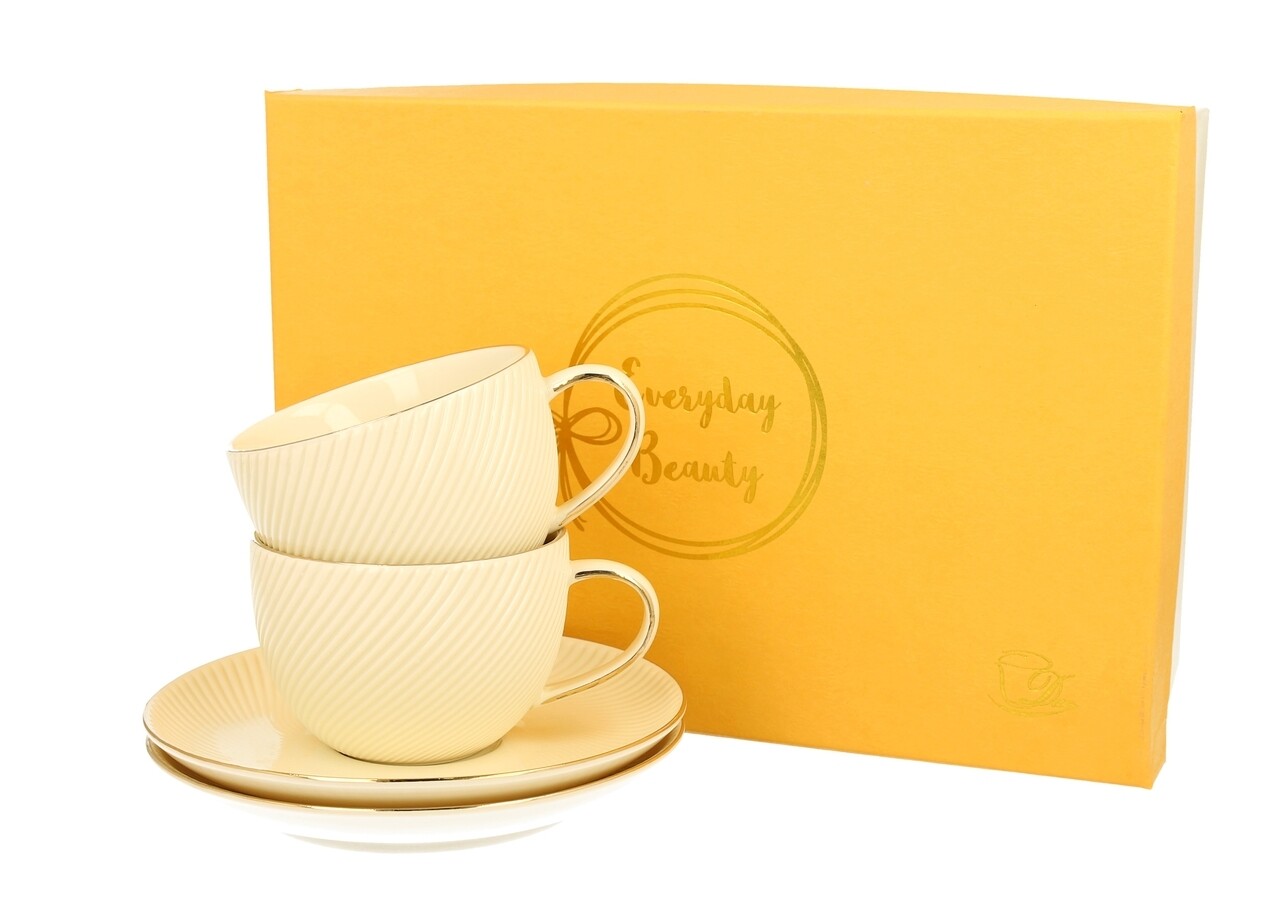 Set 2 cesti cu farfurie Ice Cream, Duo, 220 ml, portelan, crem/auriu