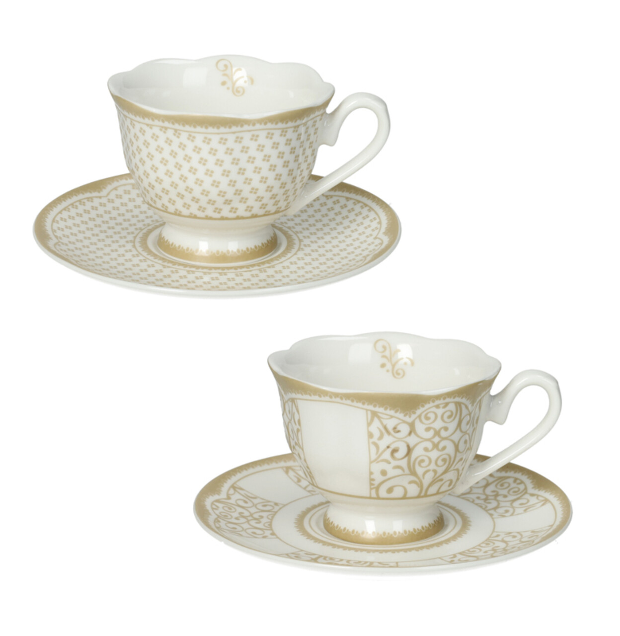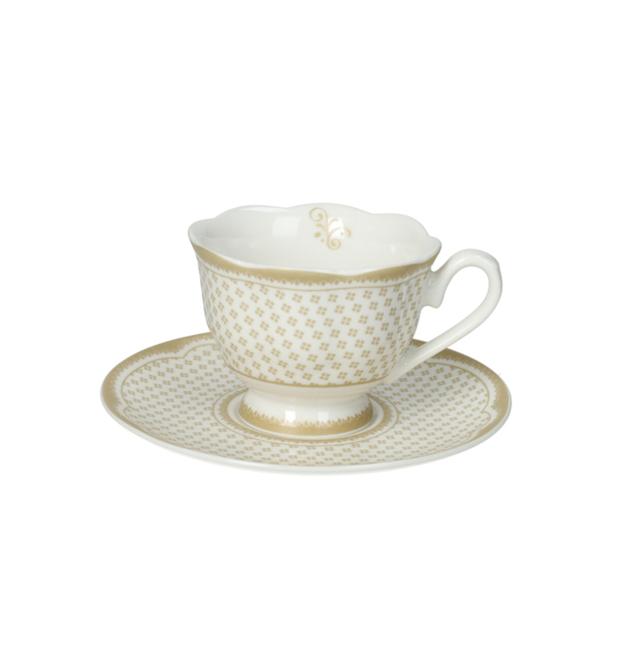 Set 2 cesti cu farfurie pentru cafea, Golden Eye v1, Brandani, D11.5x6 cm, portelan New Bone China