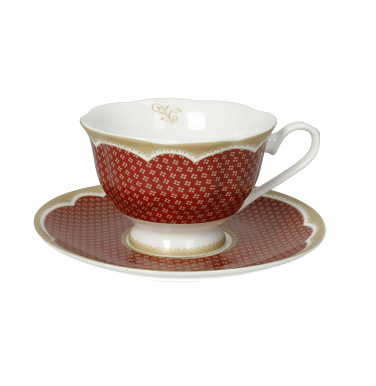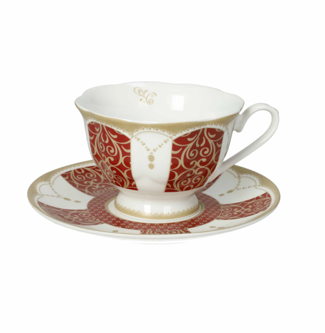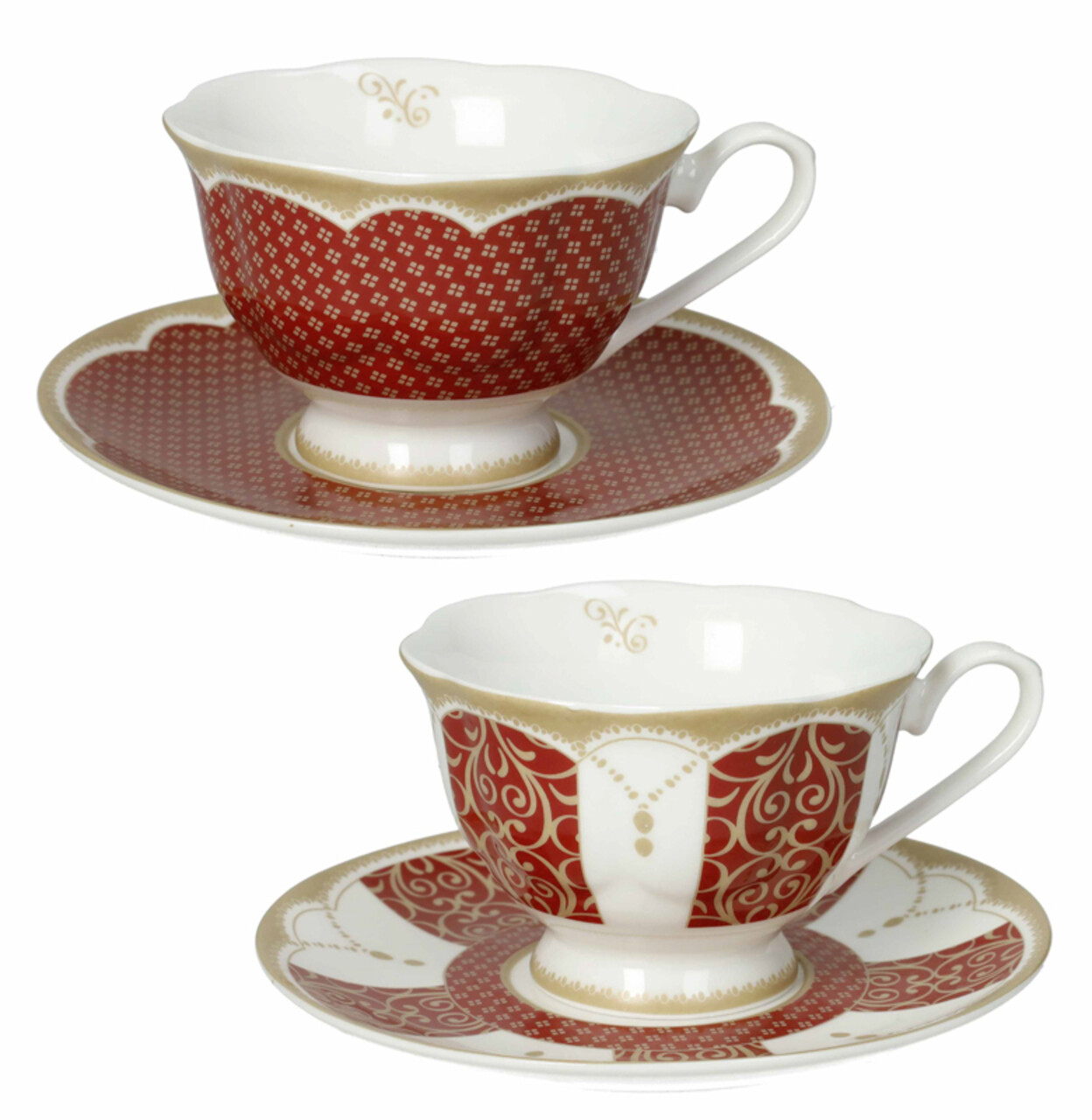 Set 2 cesti cu farfurie pentru ceai, Golden Eye Red, Brandani, D15x7.5 cm, portelan New Bone China
