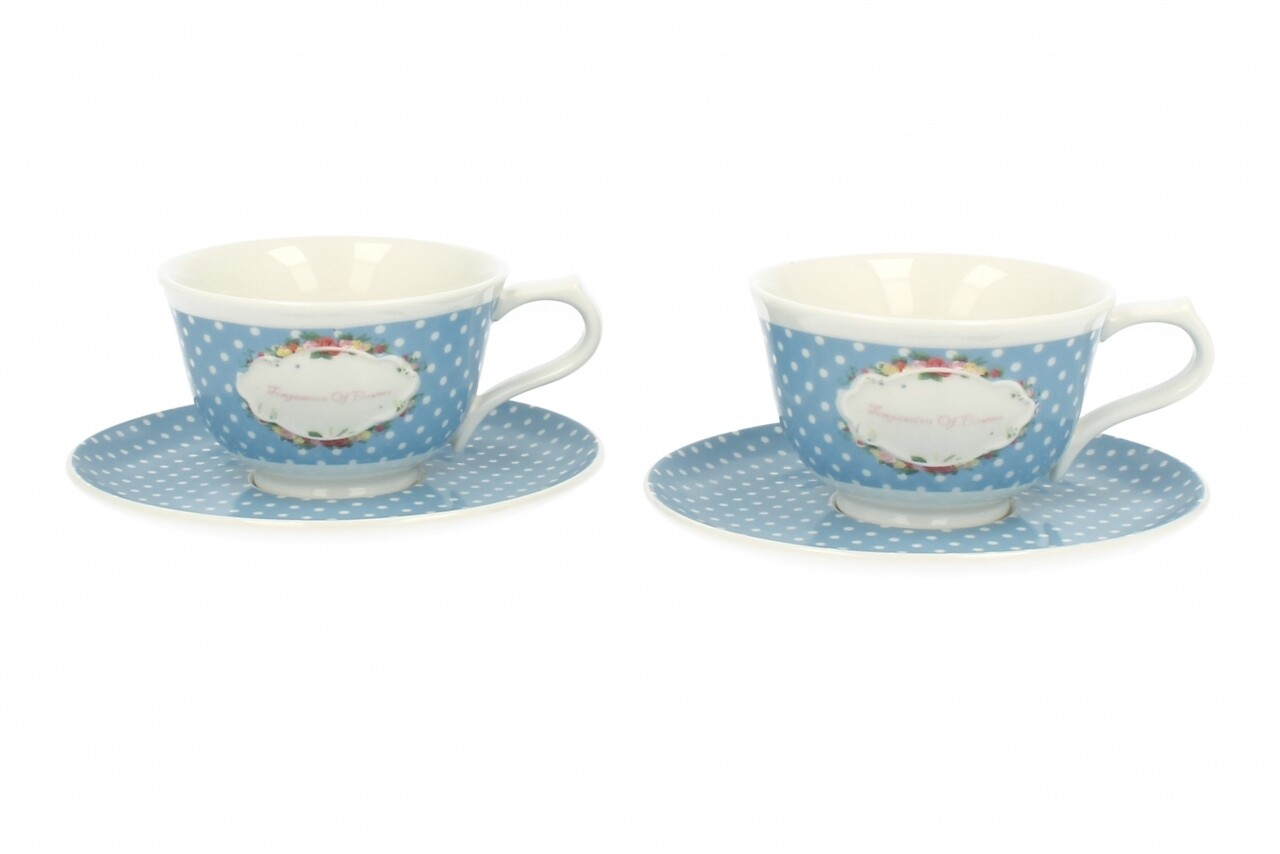 Set 2 cesti cu farfurie Retro Blue, Duo, 200 ml, portelan, albastru
