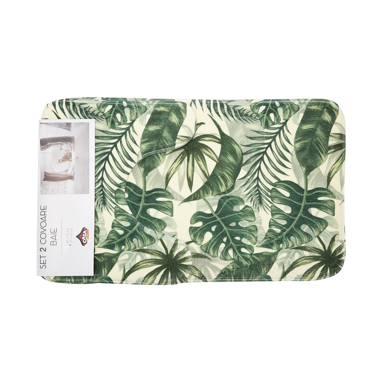 Set 2 covorase de baie, Casa Plastor, Leaves, 45 x 73 cm, 37 x 45 cm, poliester/poliuretan/PVC, verde/alb