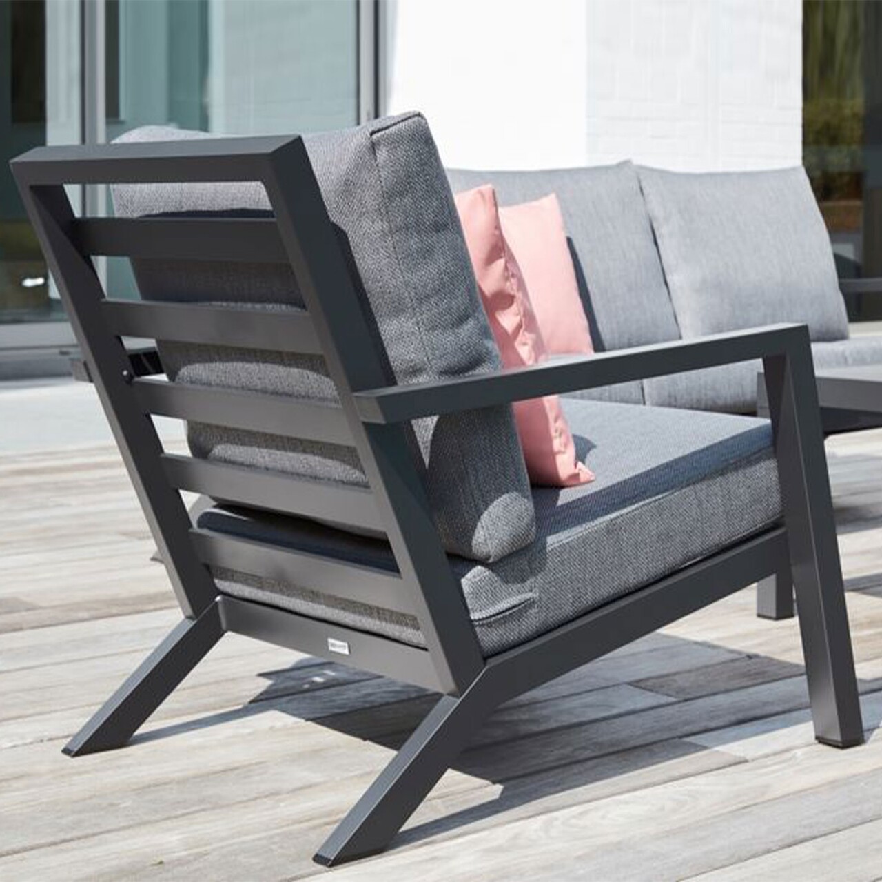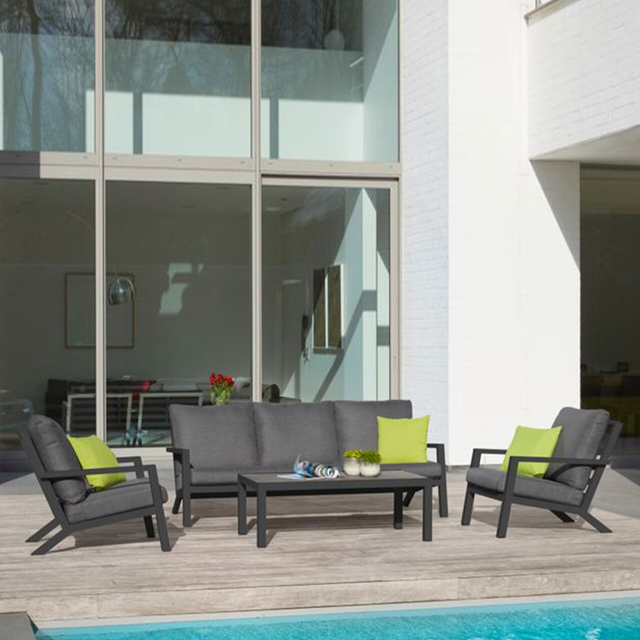 Realizat din structura de aluminiu vopsita in camp electrostatic . Include perne din tesatura olefin cu protectie impotriva umezelii si a decolorarii. Husele pernelor sunt prevazut cu fermoar pentru a fi mai usor de indepartat si curatat.