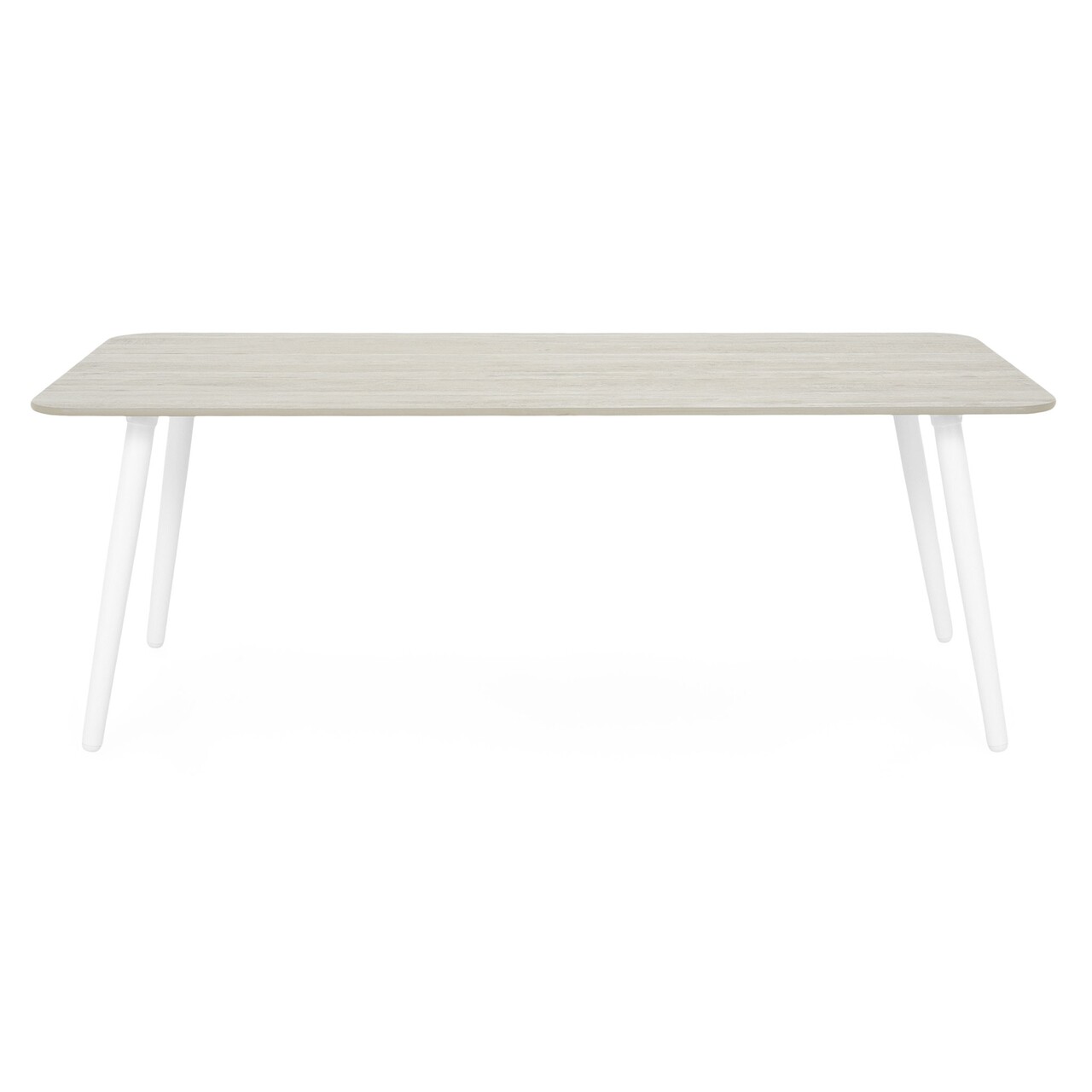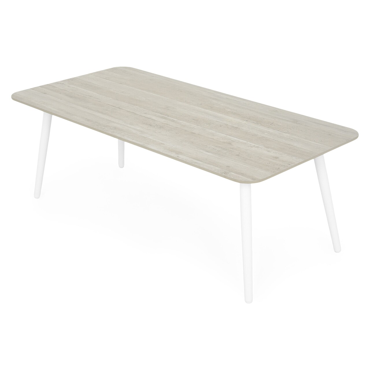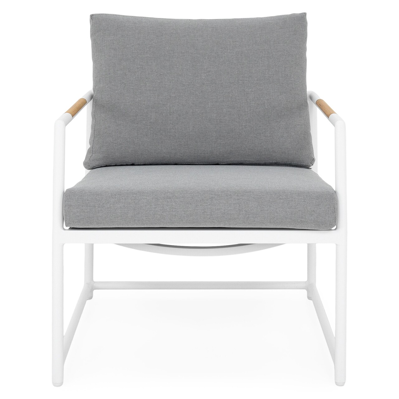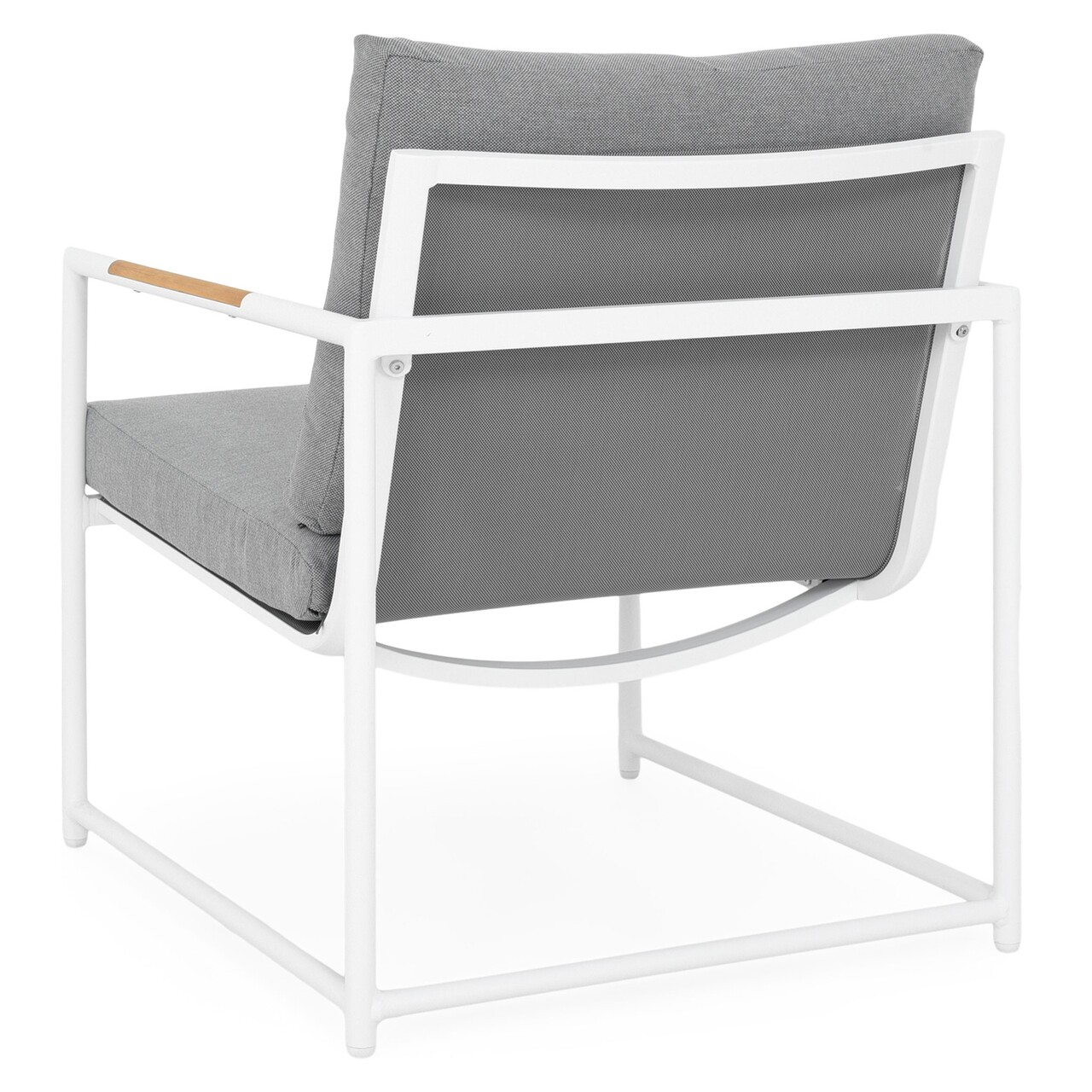 Realizat din structura de aluminiu vopsita in camp electrostatic. Sezutul si spatarul sunt realizate din textilina fina cu protectie UV. Include perne din tesatura Olefin cu protectie impotriva umezelii si a decolorarii. Husele pernelor sunt prevazute cu fermoar pentru a fi mai usor de indepartat si curatat. Insertii lemn de teak pe brate. Topul masutei este realizat din ceramica.