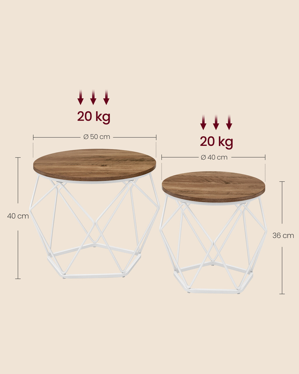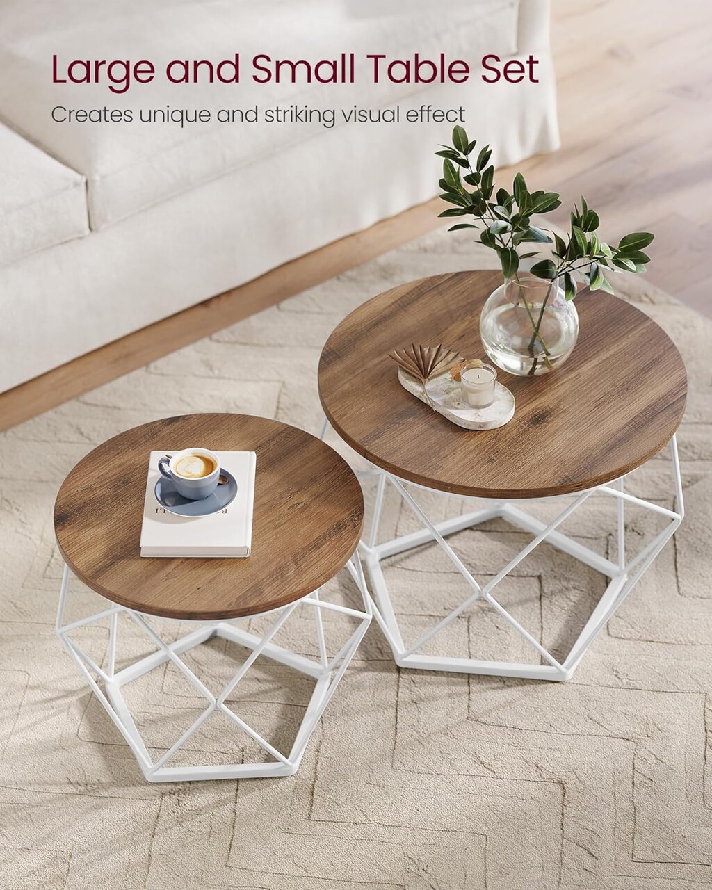 Dimensiuni compacte Masuta de cafea mare are dimensiunile 50 x 40 cm (Dia. x H) si masuta de cafea mica are dimensiunile 40 x 36 cm (Dia. x H).
