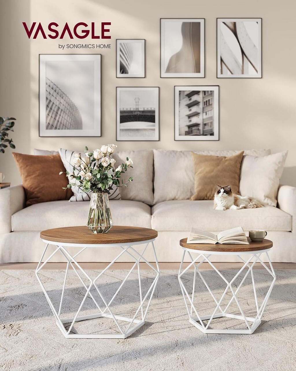 Set 2 masute de cafea Modern, Vasagle, blat detasabil, 50x40 cm, max 20 kg, otel/PAL, alb/maro