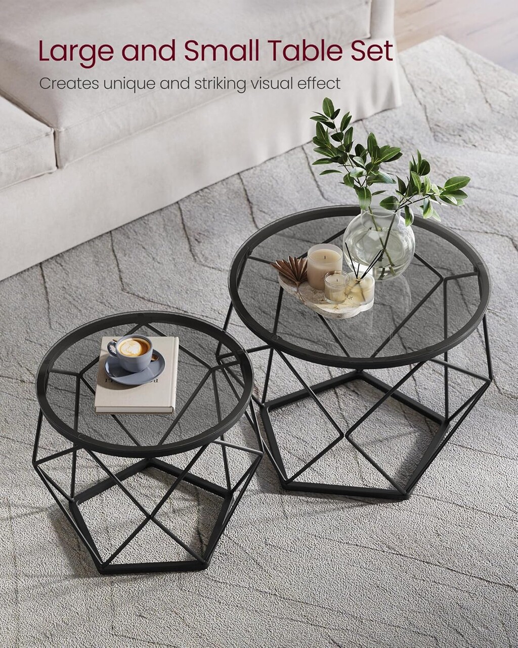 Set 2 masute de cafea Modern, Vasagle, blat detasabil, 50x40 cm, max 20 kg, otel/sticla, gri/negru