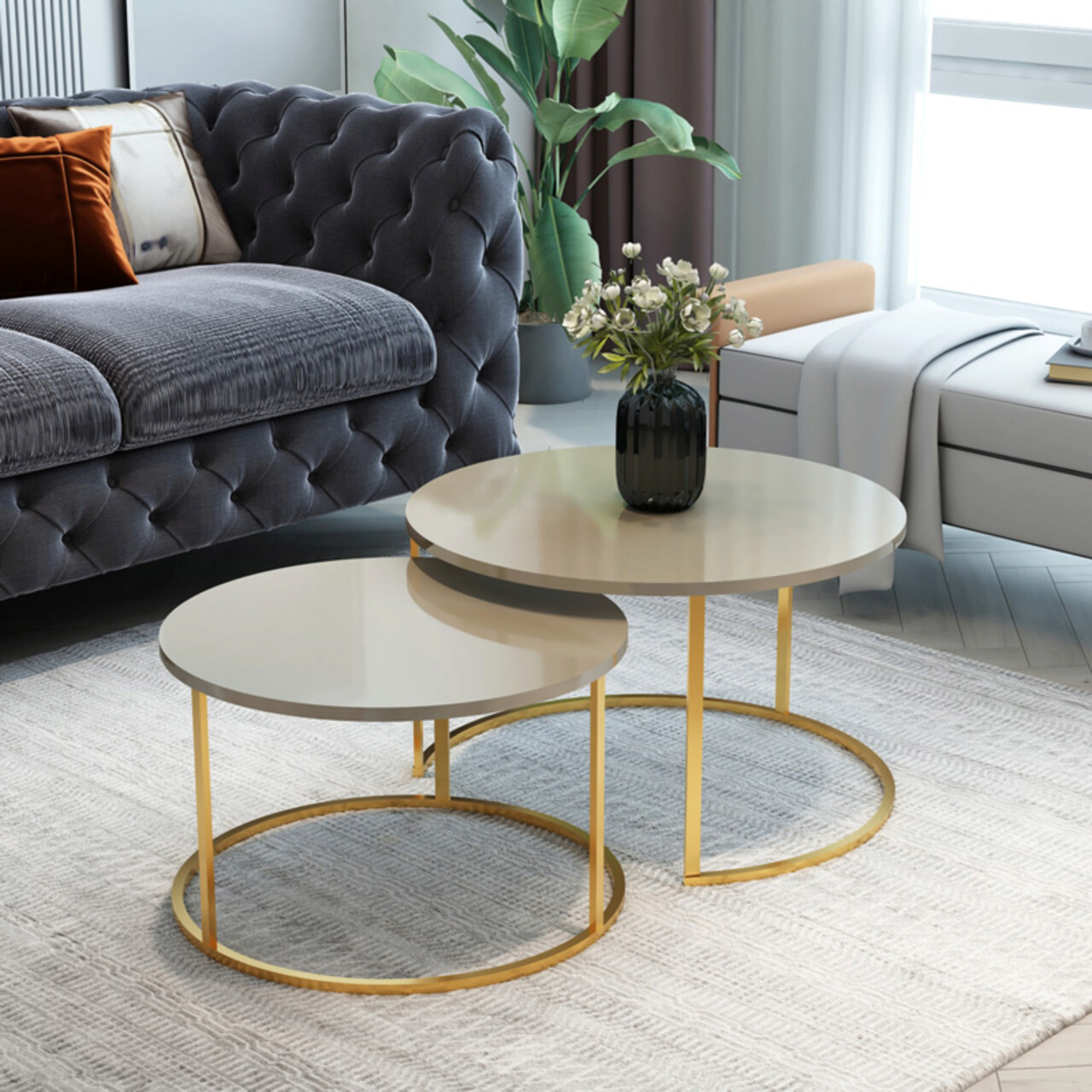 Set 2 masute de cafea Solme, Pakoworld, 75x75x45 cm/60x60x40 cm, PAL/metal, bej/auriu