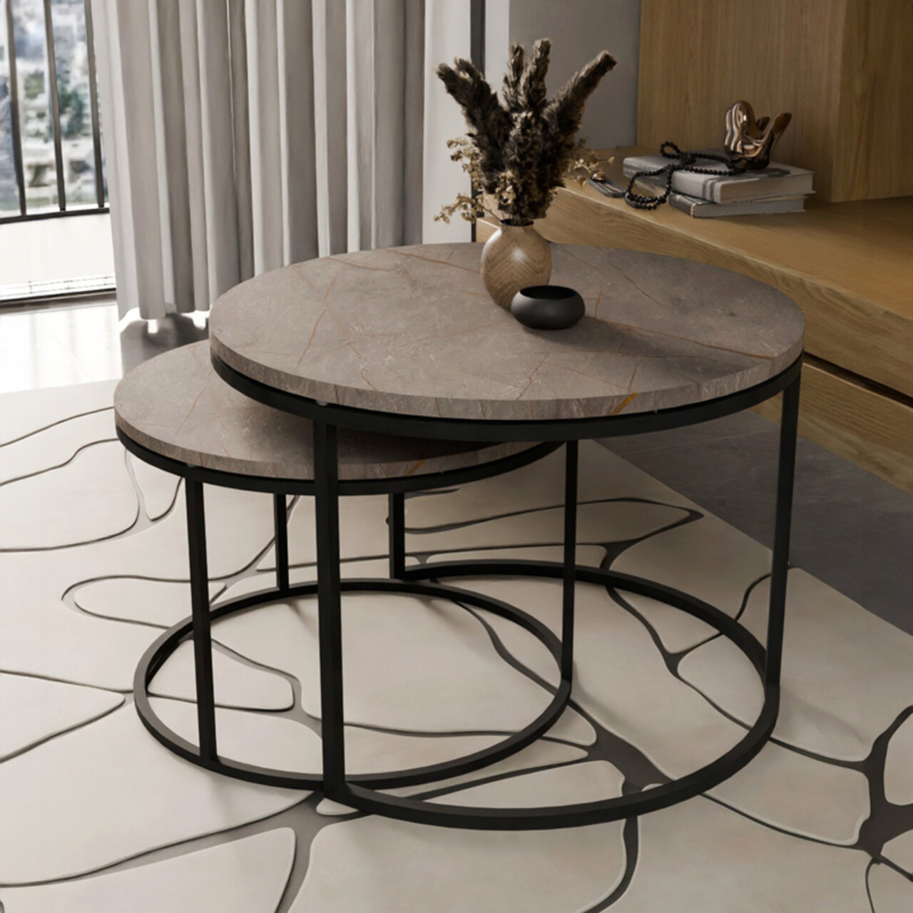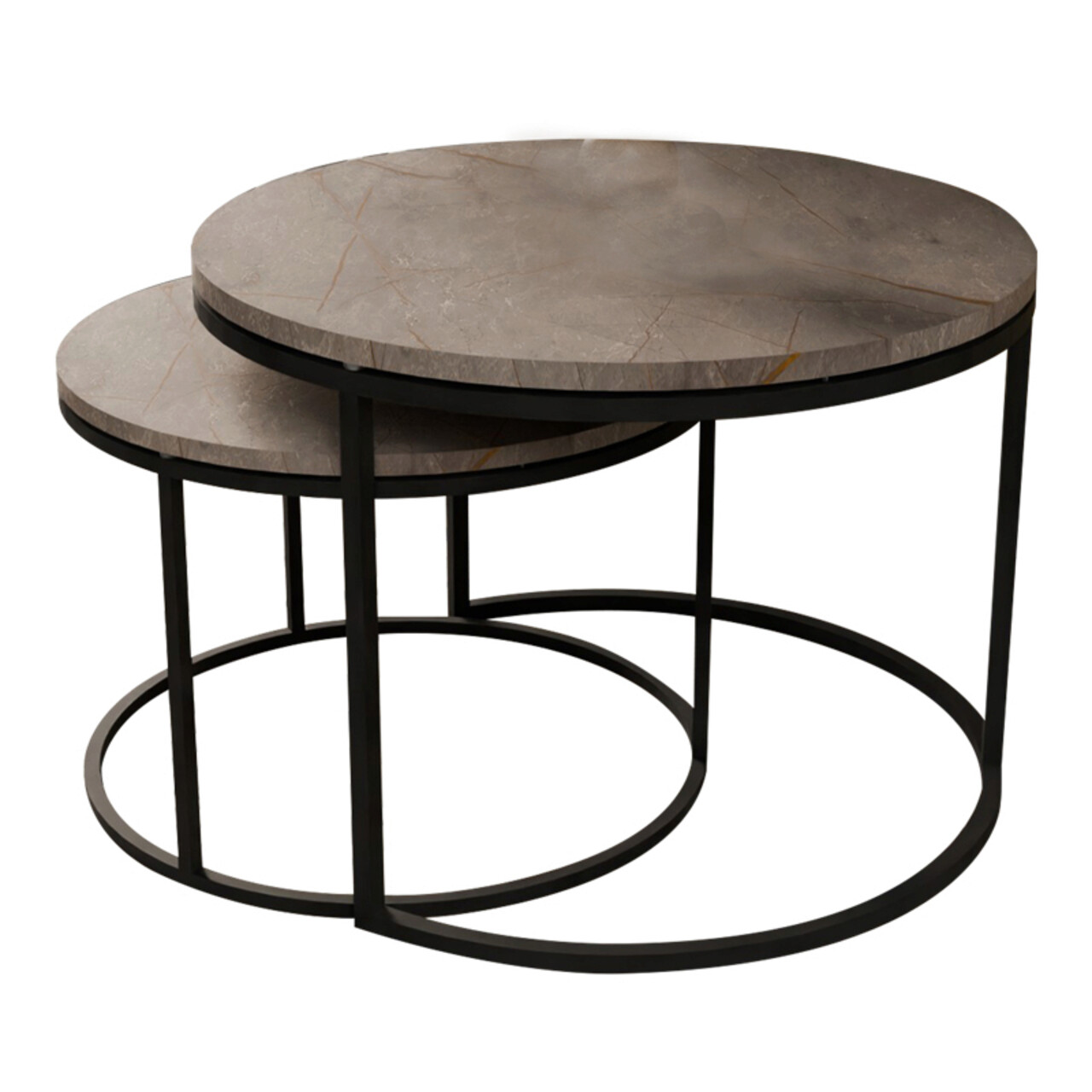 Set 2 masute de cafea Solme, Pakoworld, 75x75x45 cm/60x60x40 cm, PAL/metal, gri marmorat/negru