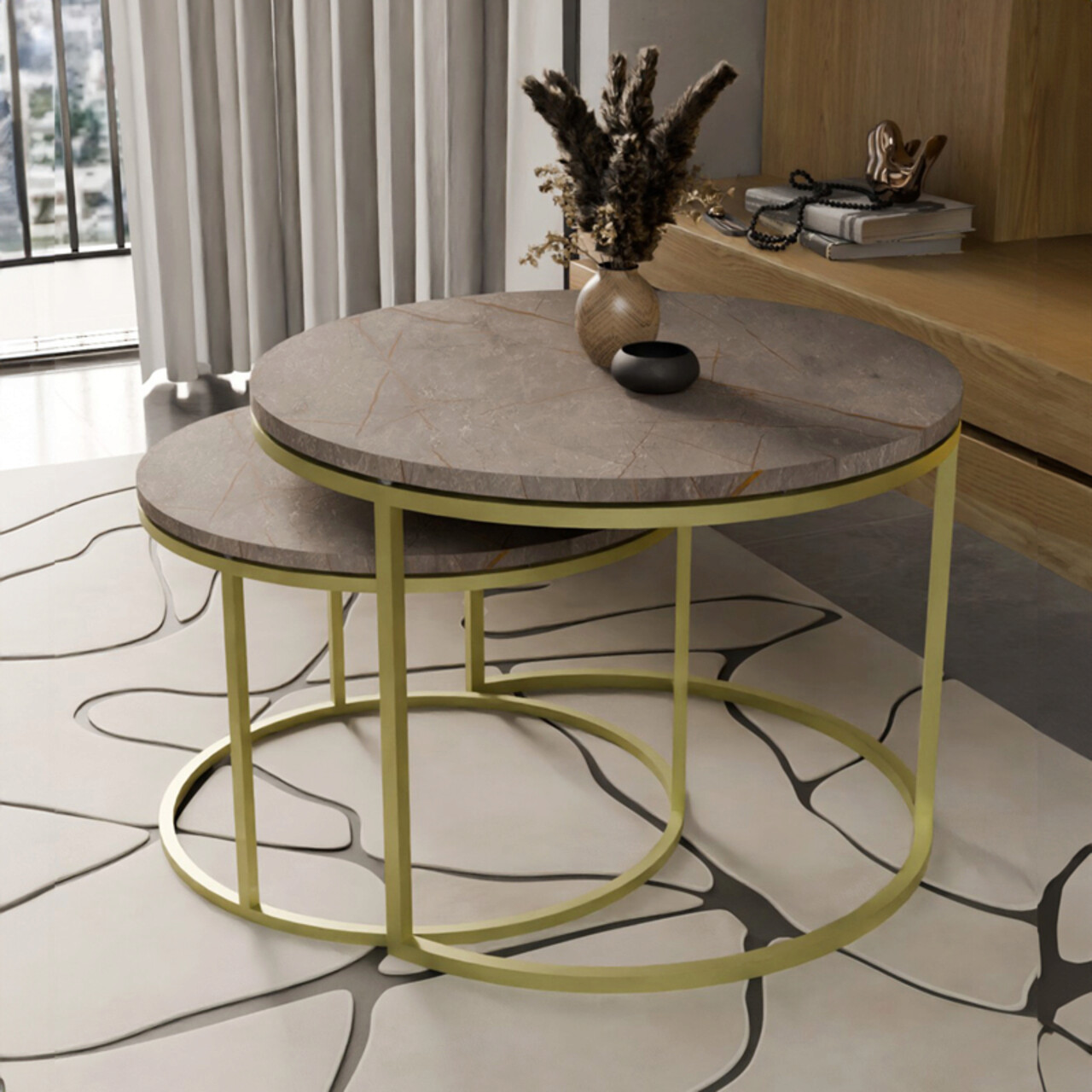 Set 2 masute de cafea Solme, Pakoworld, 75x75x45 cm/60x60x40 cm, PAL/metal, gri marmorat/auriu