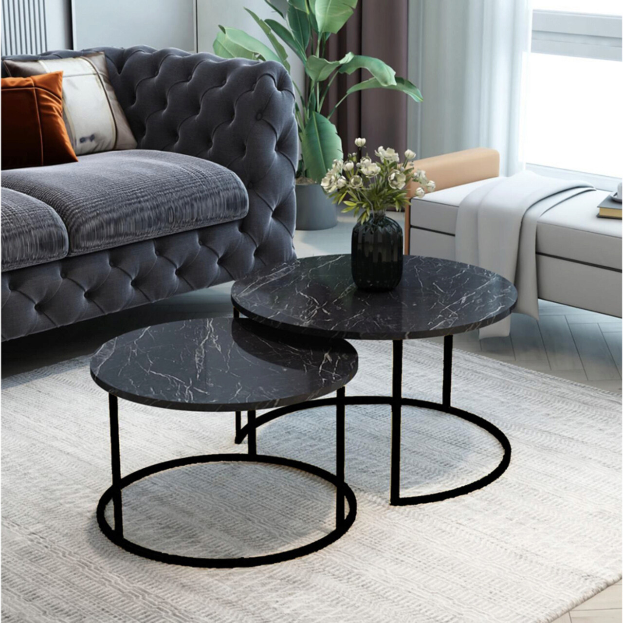 Set 2 masute de cafea Solme, Pakoworld, 75x75x45 cm/60x60x40 cm, PAL/metal, negru marmorat