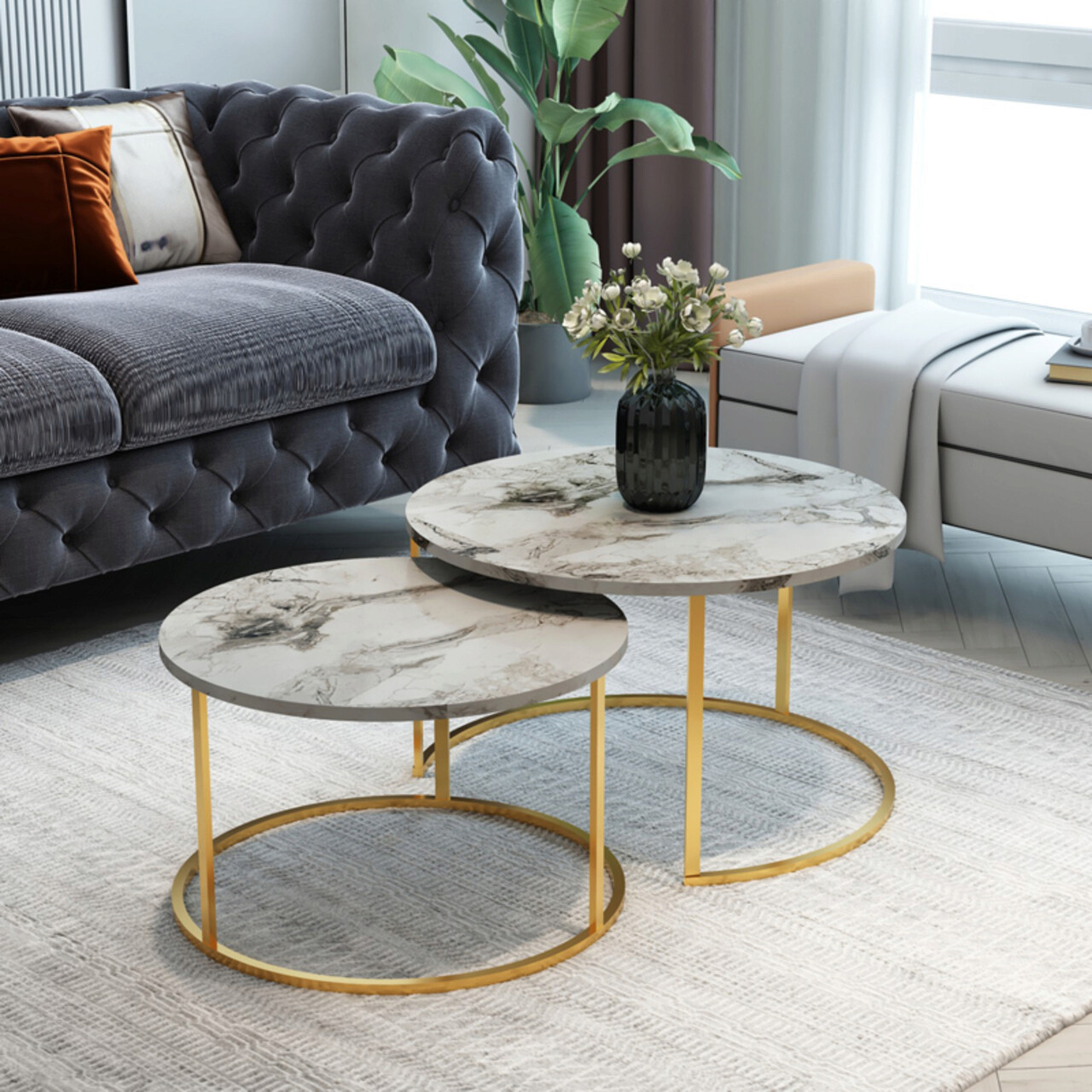 Setul include o masuta 75 x 75 x H45 cm si o masuta 60 x 60 x H40 cm.