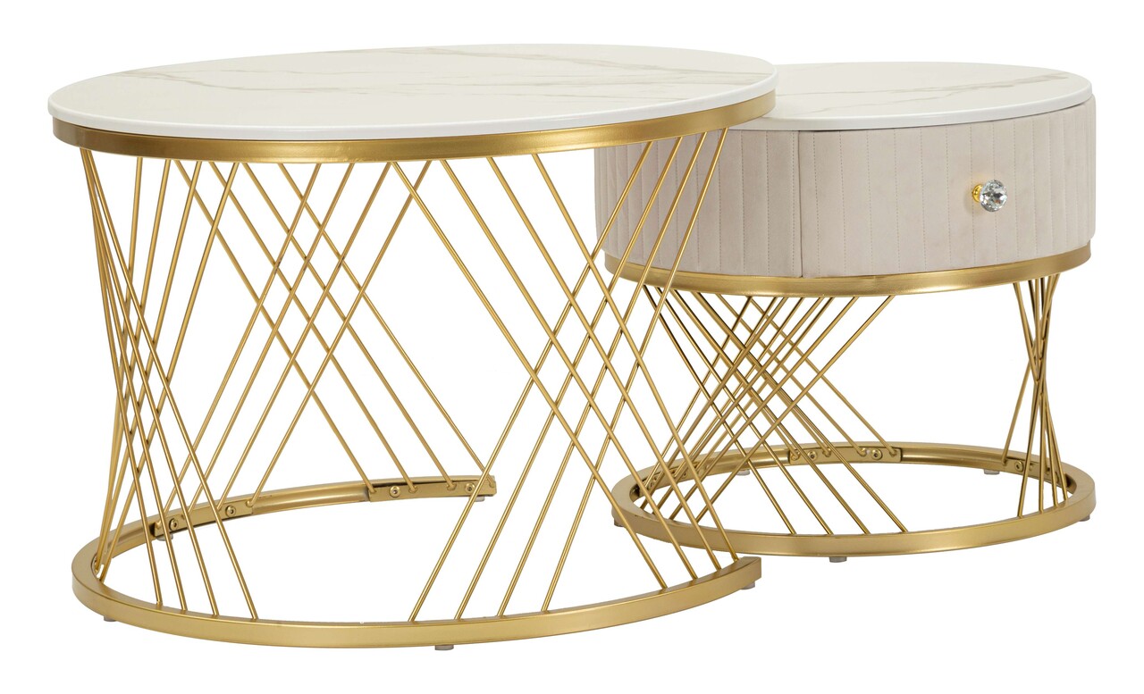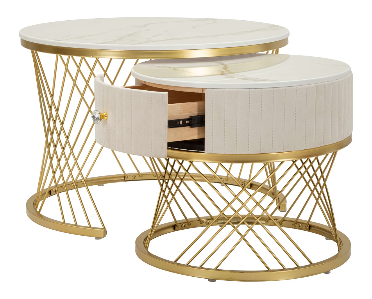 Un set cu design de impact, ce combina structura aurie cu detalii decorative originale. Perfect pentru a aduce un aer luxos si modern in orice zona de relaxare. Dimensiuni interioare sertar: 27x29x7 cm.