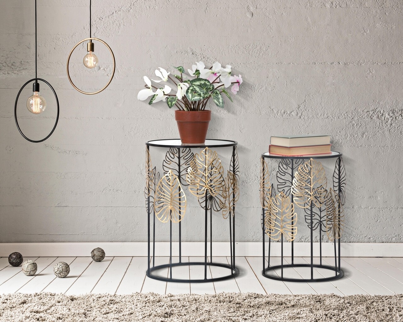 Set 2 masute Foglia, Mauro Ferretti, 38x55 cm / 33x50 cm, fier/sticla, negru/auriu