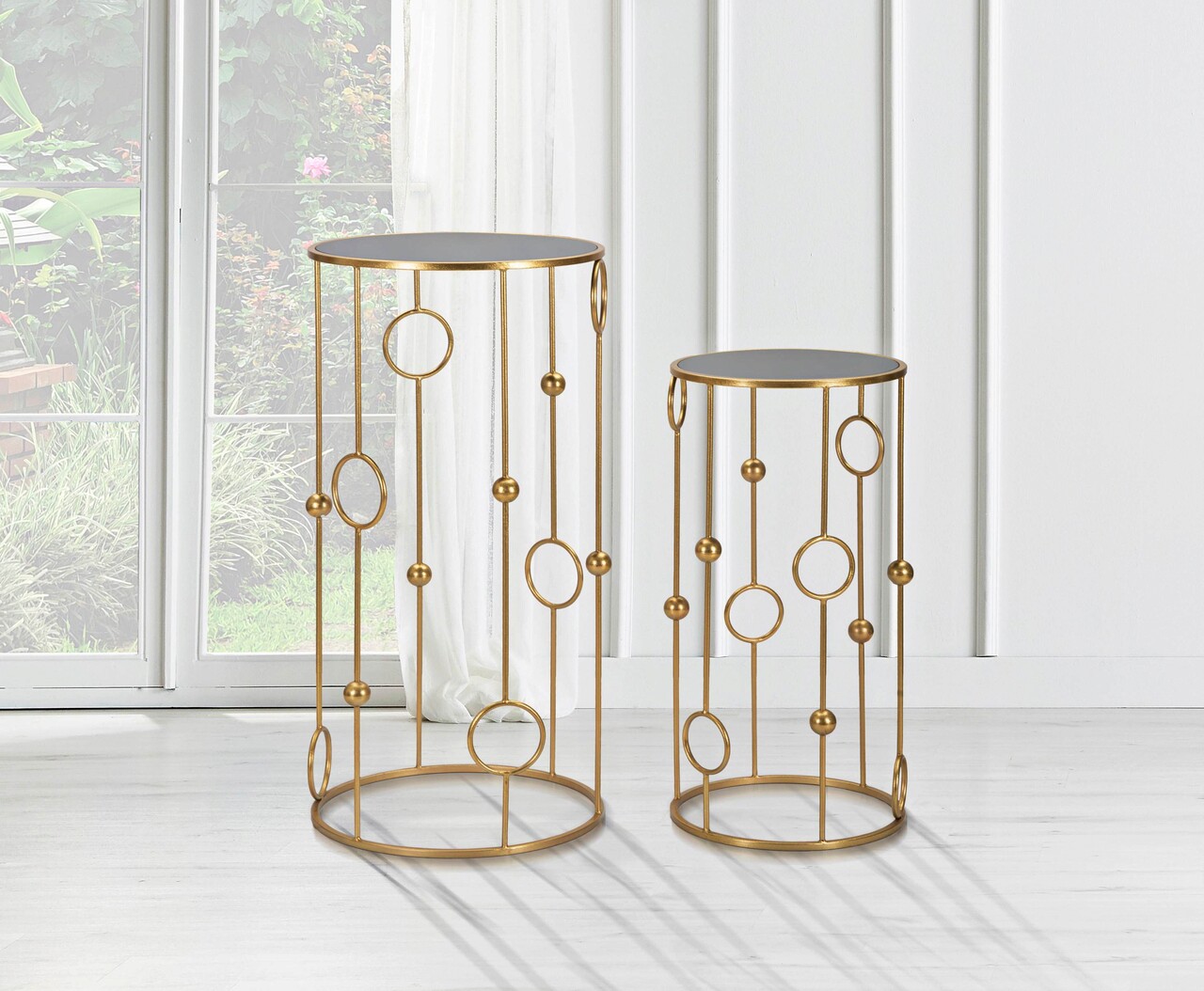 Set de 2 masute rotunde din metal auriu, cu linii simple, ornamentate cu decoratiuni circulare si sferice, cu blat din sticla oglindita. Compozitie material: fier, MDF, oglinda