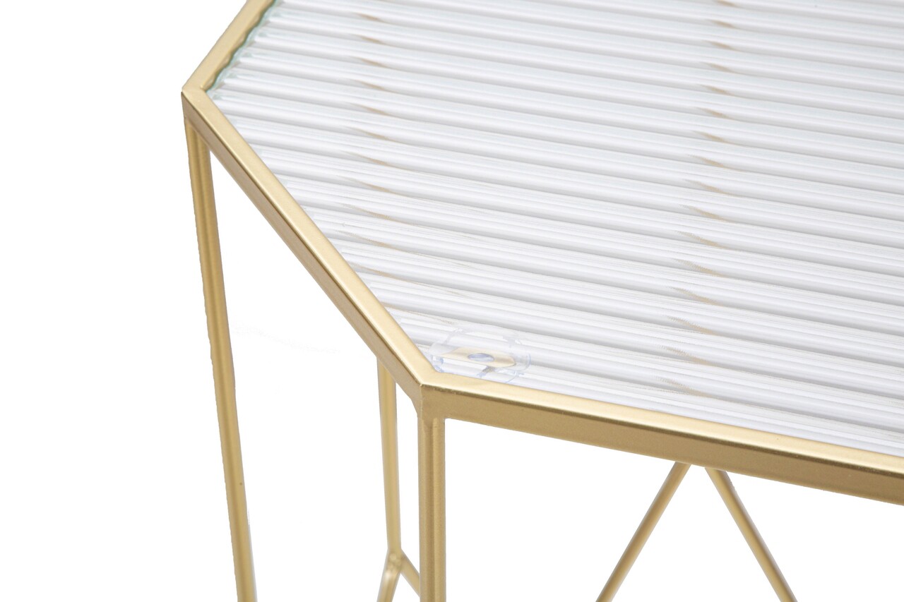 Mese patrate din metal auriu, cu linii geometrice care creeaza o senzatie de profunzime. Completate cu blat de sticla fin lucrat.