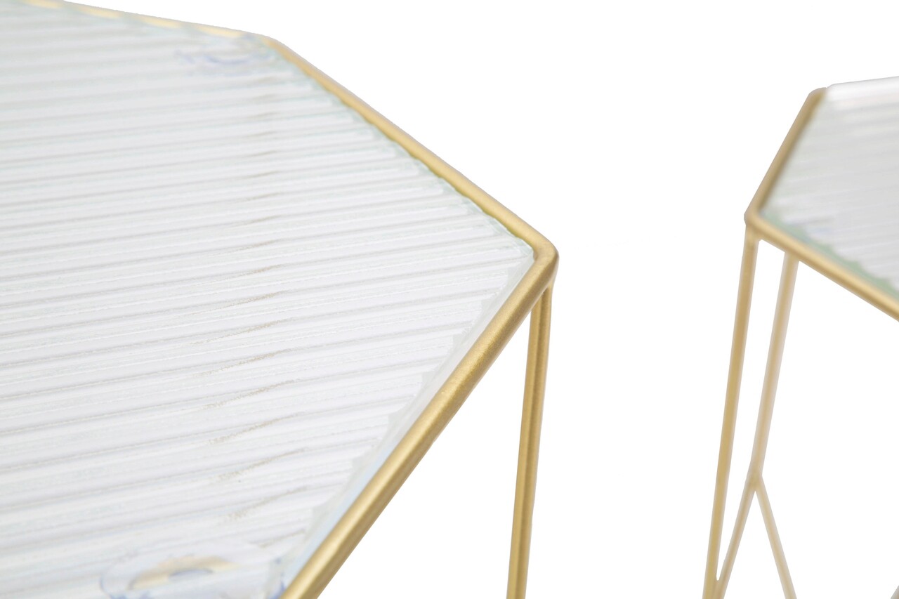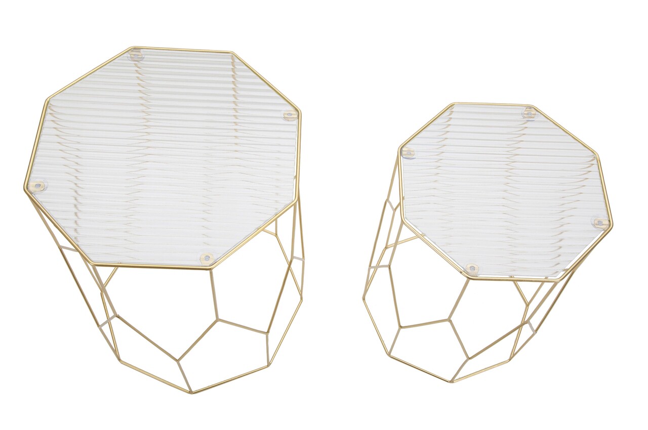 Mese patrate din metal auriu, cu linii geometrice care creeaza o senzatie de profunzime. Completate cu blat de sticla fin lucrat.