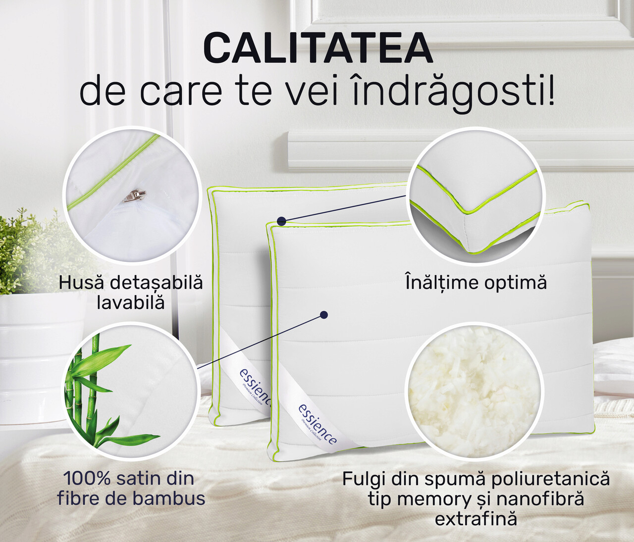 Set 2 perne 50x70 cm, Essience Premium Collection, husa satin bambus; umplutura fulgi memory si nanofibra extrafina; suport orto-cervical