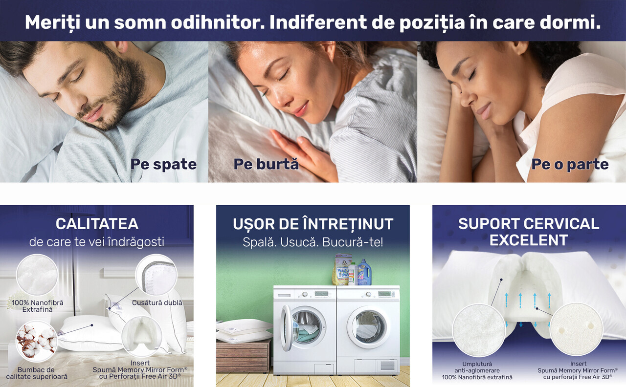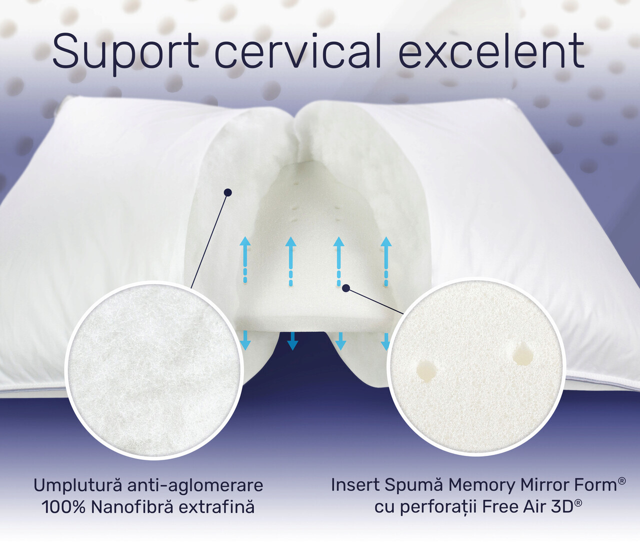 FARA DURERI CERVICALE: Cu umplutura din 100% Nanofibra Extrafina, cea mai fina si rezistenta dintre toate fibrele sintetice cunoscute, aceasta perna este conceputa sa asigure un suport corect al zonei cervicale. Mai mult decat atat, insertul din spuma Memory Mirror Form cu perforatii Free Air 3D reactioneaza la caldura corpului, mulandu-se pe cap, gat si umeri pentru o pozitie corecta a coloanei vertebrale in timpul somnului.