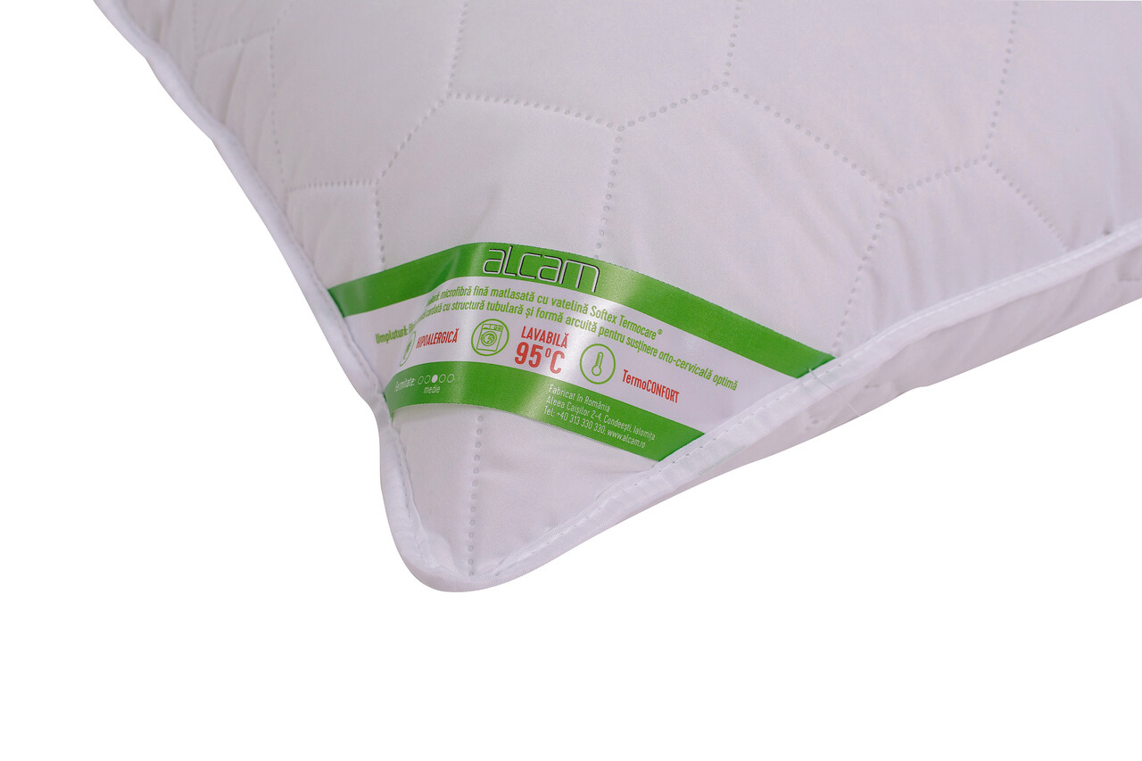 Umpluta cu fibra siliconica cardata cu structura tubulara si forma arcuita, perna Alcam este conceputa sa asigure un suport corect al zonei cervicale. Ea este proiectata sa se adapteze tuturor pozitiilor de dormit, oferind un confort desavarsit indiferent daca dormi pe spate, pe burta sau pe o parte.