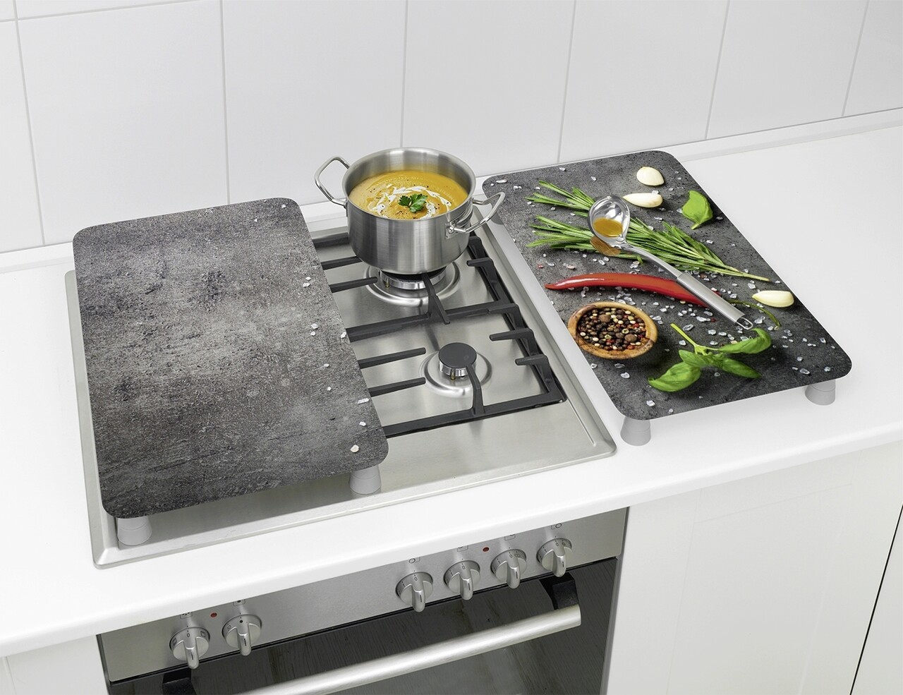 Setul de 2 protectii este perfect pentru plitele electice sau cele pe gaz. Cele 8 picioare speciale anti-alunecare incluse asigura intotdeauna spatiul necesar. Datorita proprietatilor lor rezistente la caldura sunt potrivite pentru asezarea cratitelor si tigailor fierbinti. Pot fi folosite si ca extensie a blatului de lucru pentru prepararea alimentelor. Suprafata rezistenta la zgarieturi. Inaltimea picioarelor poate fi reglata si se incadreaza intre 1.8 cm si 5.5 cm.