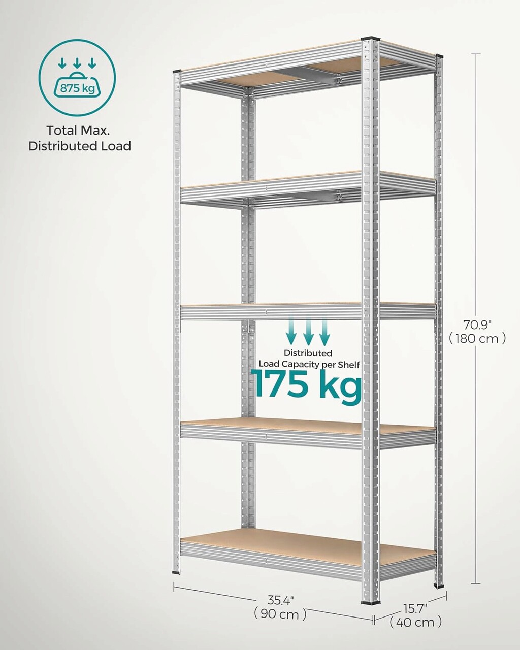 Dimensiuni mari, capacitate mare Cu dimensiuni de 40 x 90 x 180 cm si o capacitate de incarcare totala de 875 kg, unitatea de rafturi poate fi utilizata intr-un garaj, depozit, pivnita sau camera utilitara pentru a va organiza toate uneltele si echipamentele.