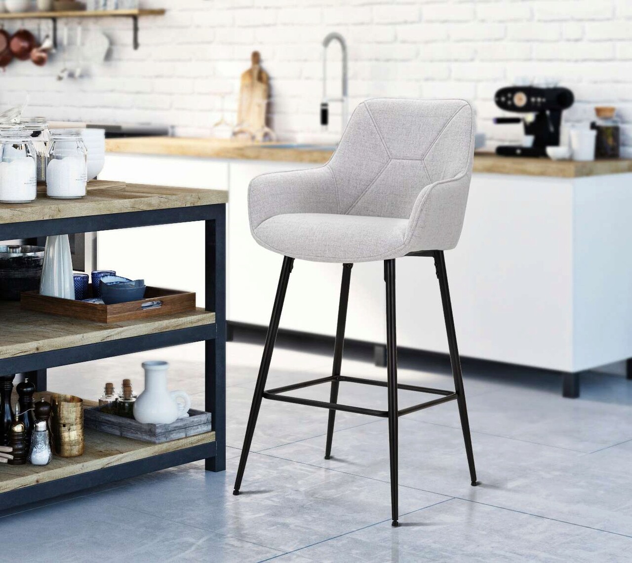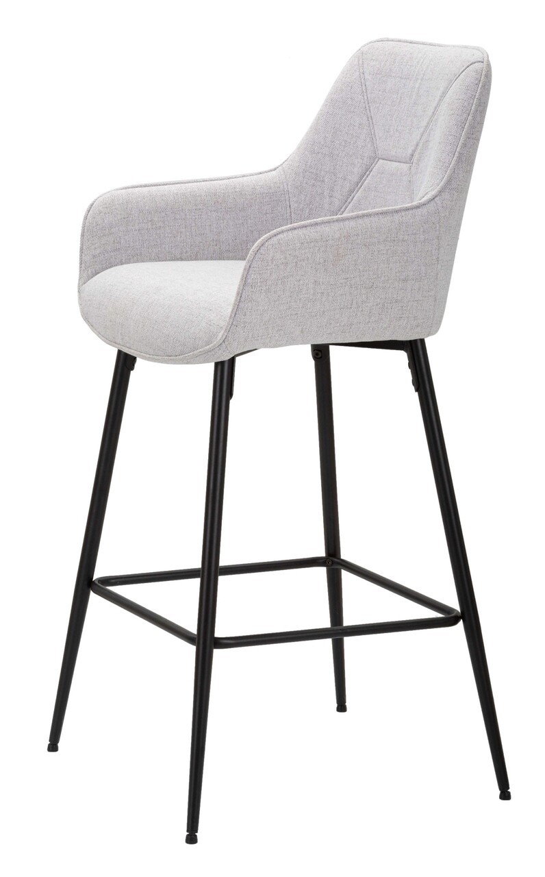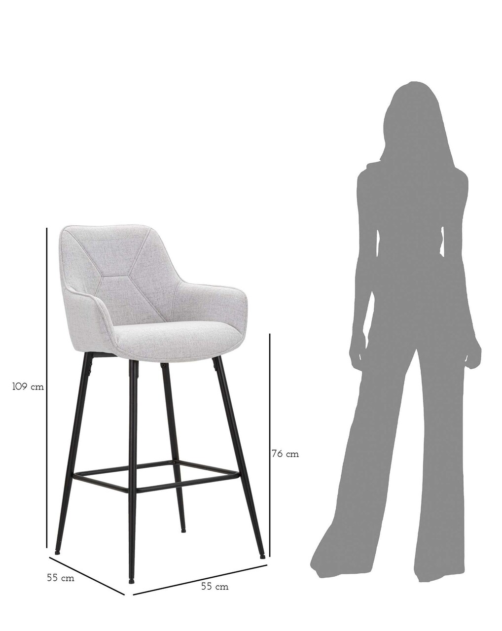 Set de 2 scaune de bar din tesatura captusita, cu cotiere practice. Tesatura impreuna cu picioarele si suportul pentru picioare din metal negru dau o nota de eleganta oricarei incaperi.