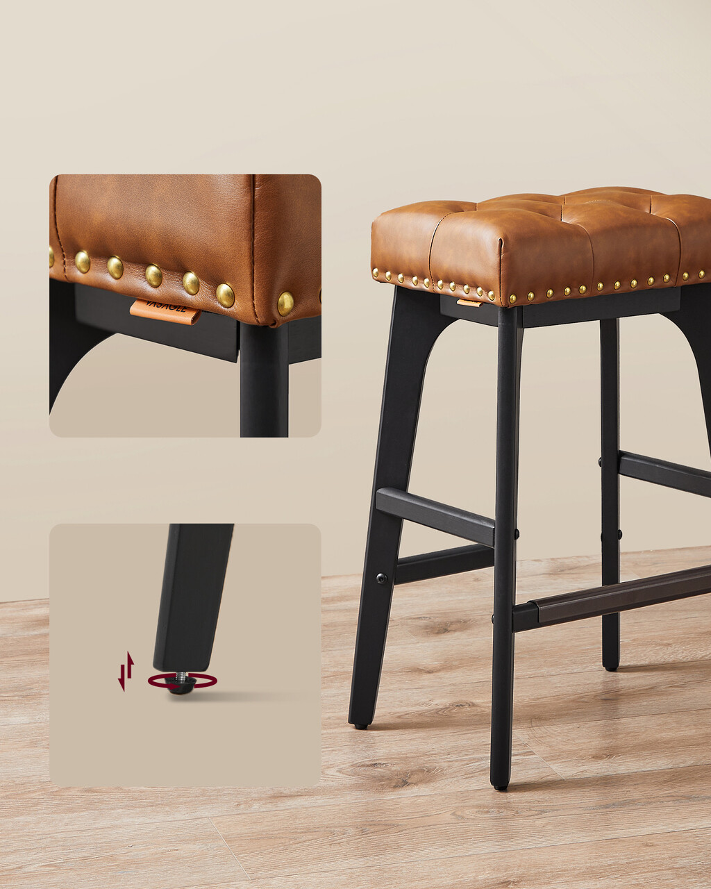 Set 2 scaune de bar, Vasagle, 44x32x66 cm, max 120 kg, lemn de cauciuc/piele ecologica, maro coffee