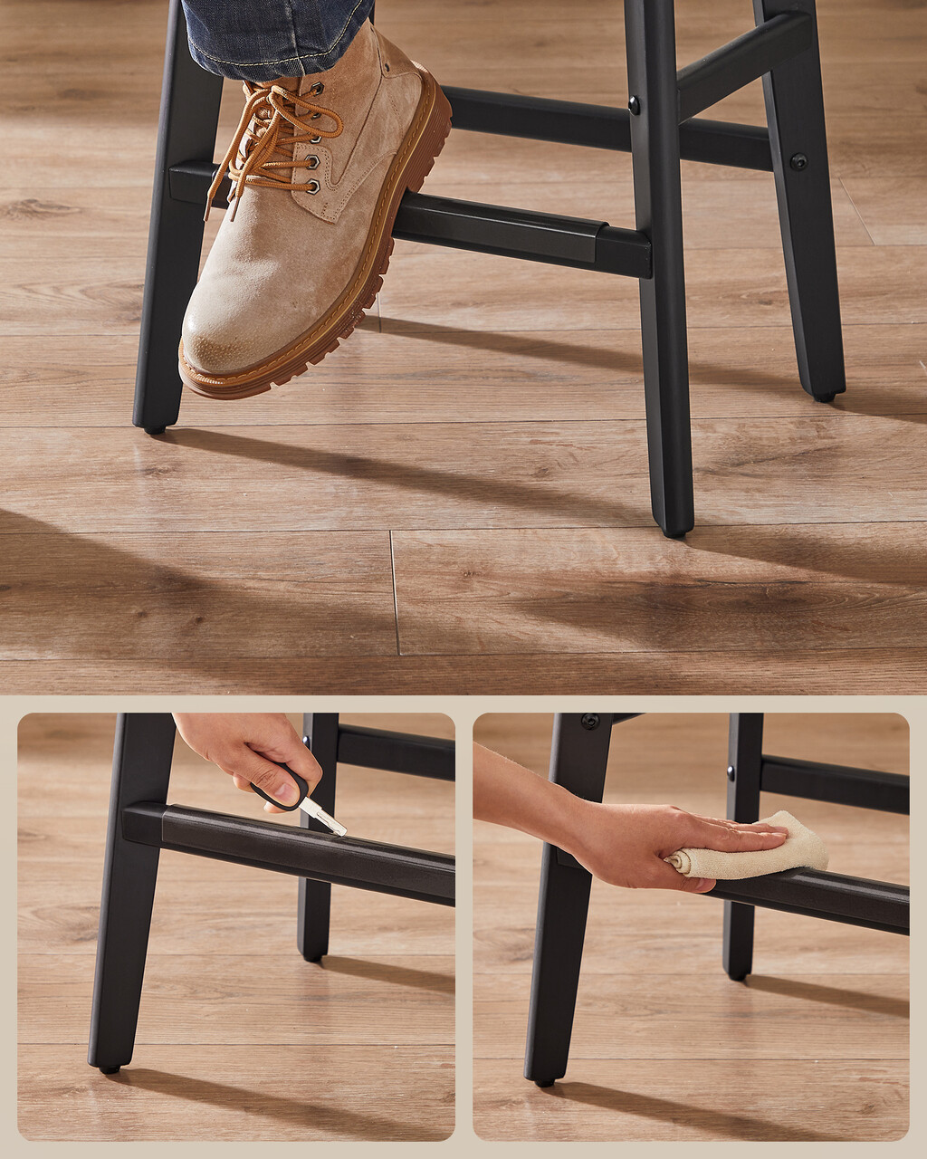 Atentie la detalii Fiecare dintre aceste scaune are un suport pentru picioare protejat cu metal, care asigura durabilitatea si curatarea usoara, chiar si atunci cand calcati pe ele cu pantofii.