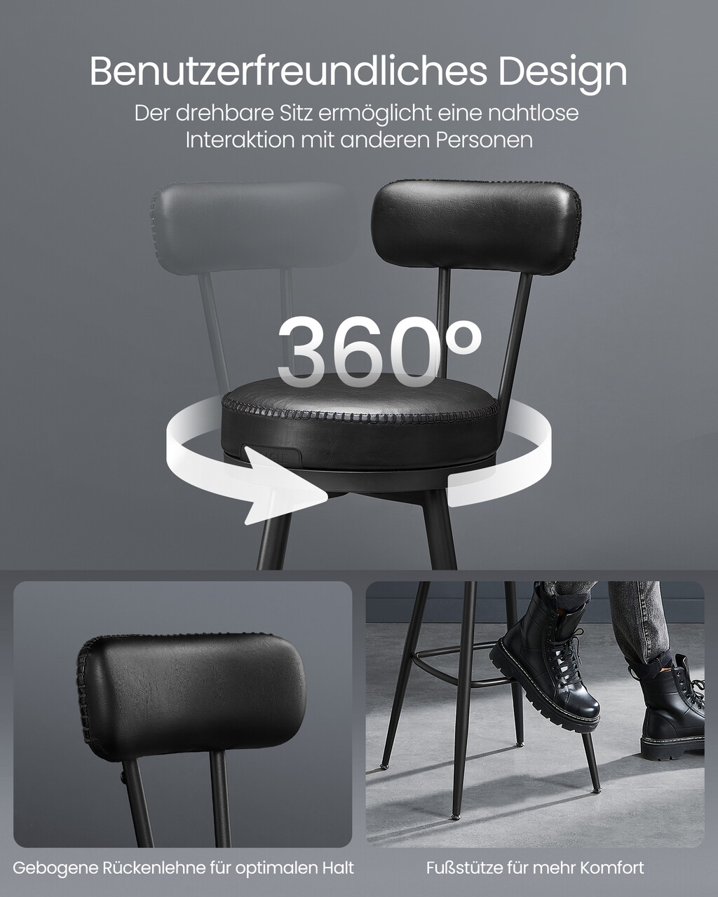 Interactiune fara limite Sezutul pivotant la 360° iti permite sa te intorci usor spre oricine din jur, transformand fiecare moment in bucatarie, barul de acasa sau camera de zi intr-o experienta sociala placuta.