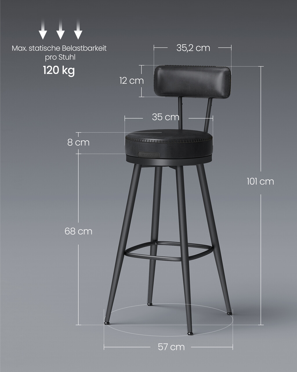 Set 2 scaune de bar, Vasagle, Ekho, 57x101 cm, sezut rotativ, otel/piele ecologica, negru
