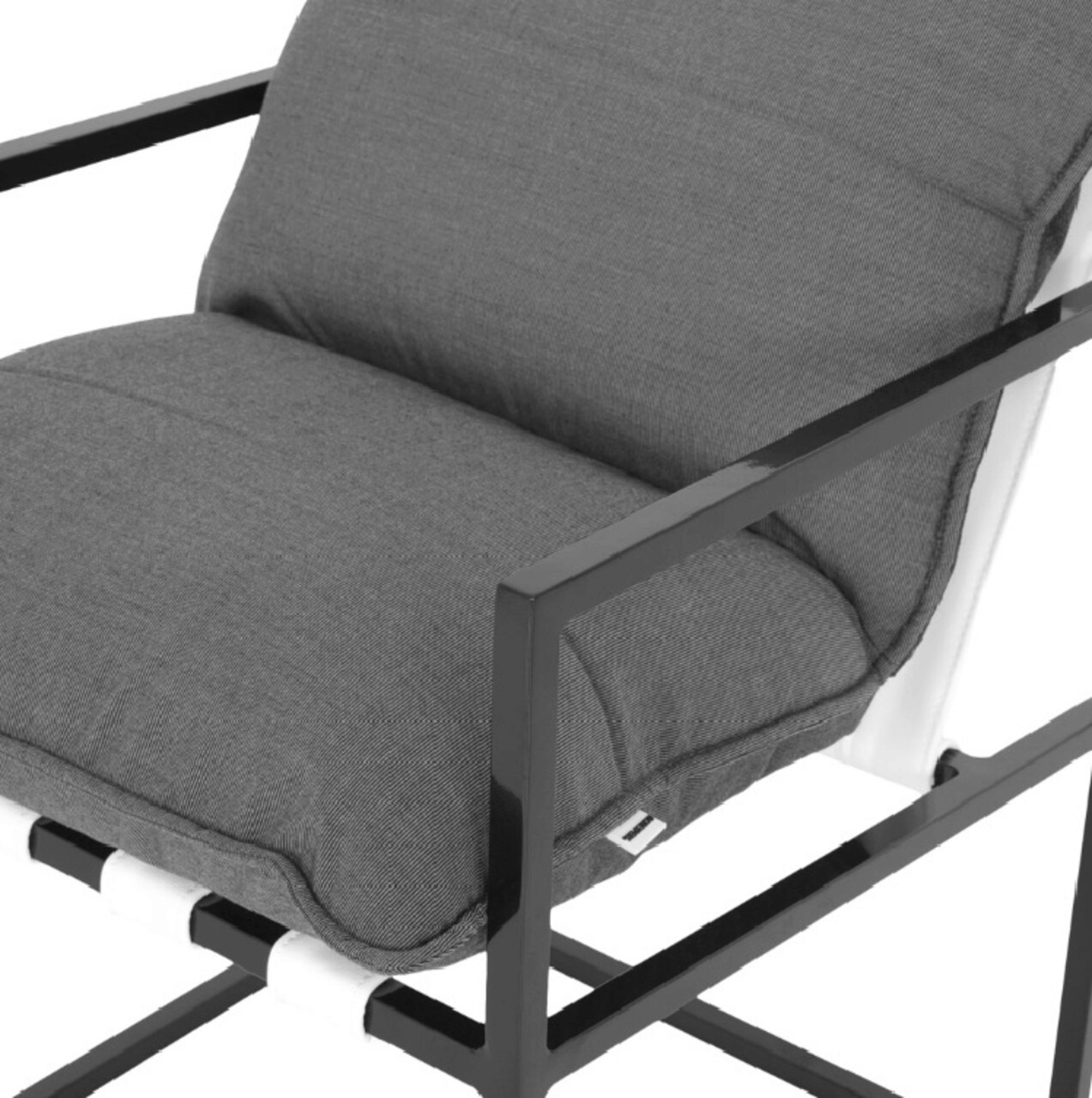 Realizat din structura solida de aluminiu vopsita in camp electrostatic. Sezutul si spatarul sunt realizate din benzi de piele si include perna imbracata cu tesatura Sunbrella impermeabila si cu protectie garantata impotriva decolorarii.