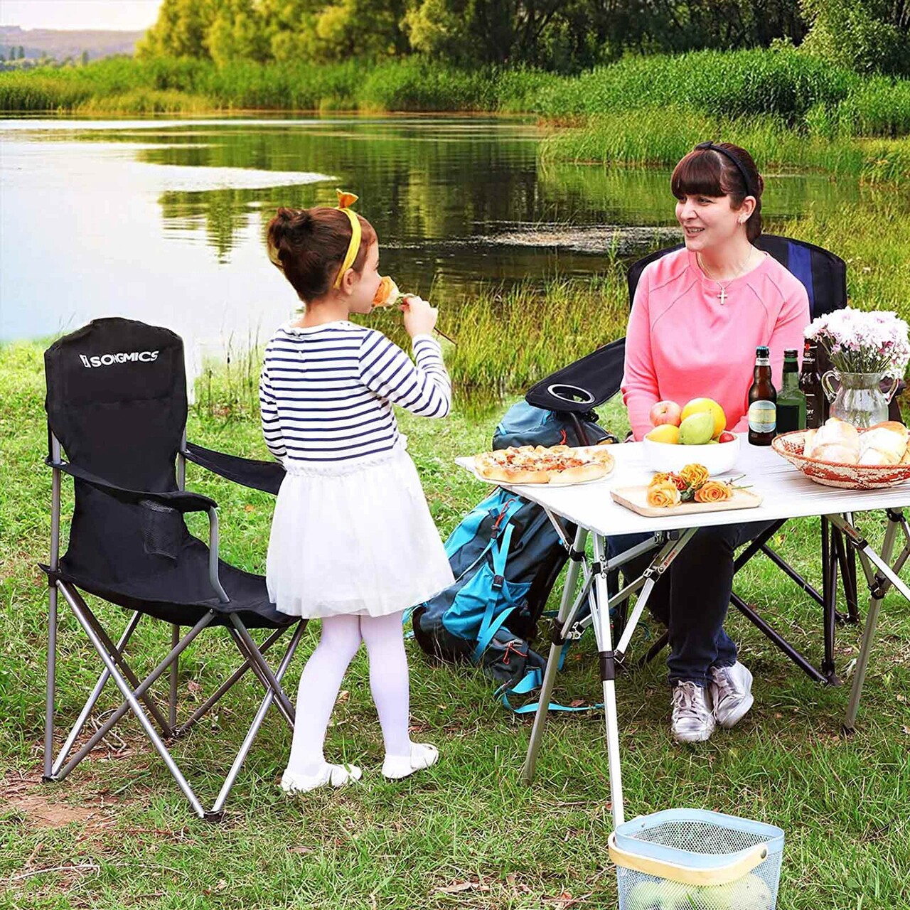 Set 2 scaune pliabile pentru camping si gradina, Songmics, max 150 kg, 86x54x97 cm, otel/tesatura Oxford, negru
