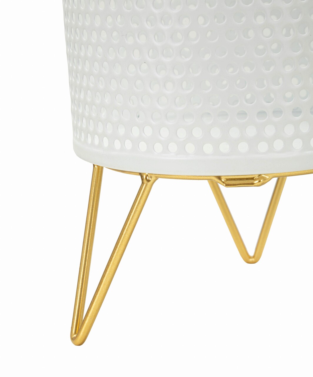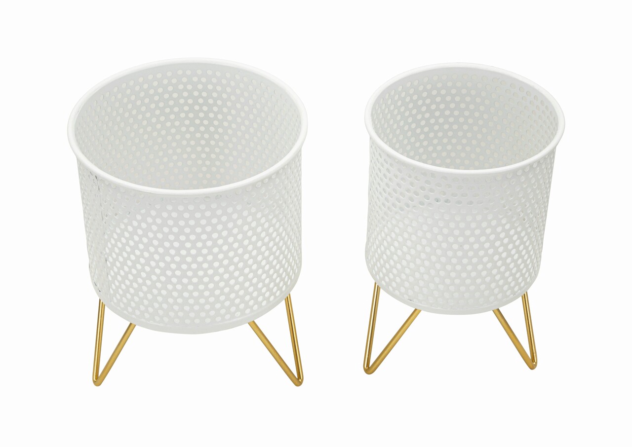 Set de suporturi pentru ghivece din metal alb decorate elegant cu sculpturi rotunde. Completate cu stativ din metal auriu. Reipientele pot fi indepartate de pe suporturi.