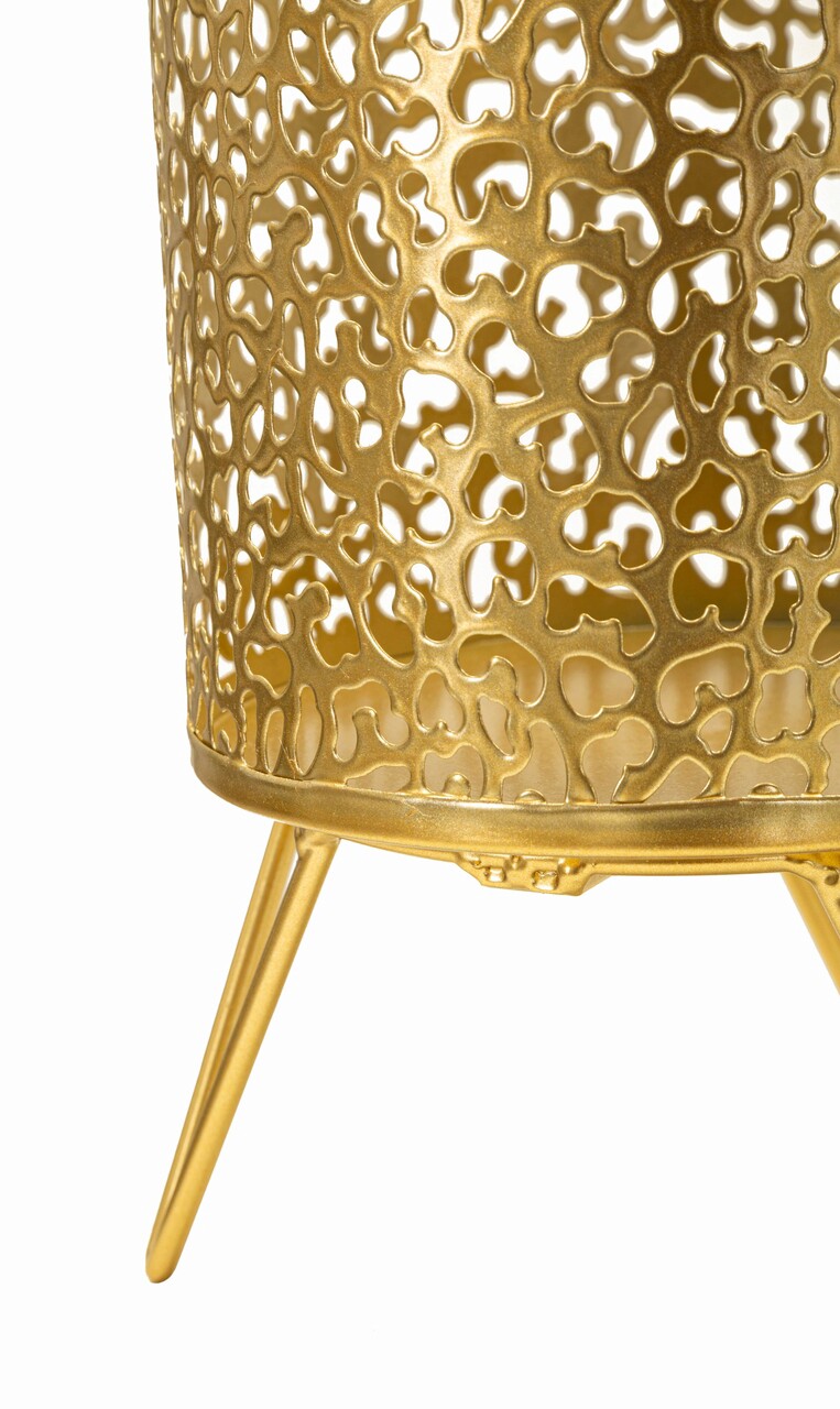 Set suporturi de ghivece din metal auriu, decorate elegant cu sculpturi neregulate si rotunjite. Completate cu suport din metal auriu. Recipientele sunt detasabile de pe suporturi.