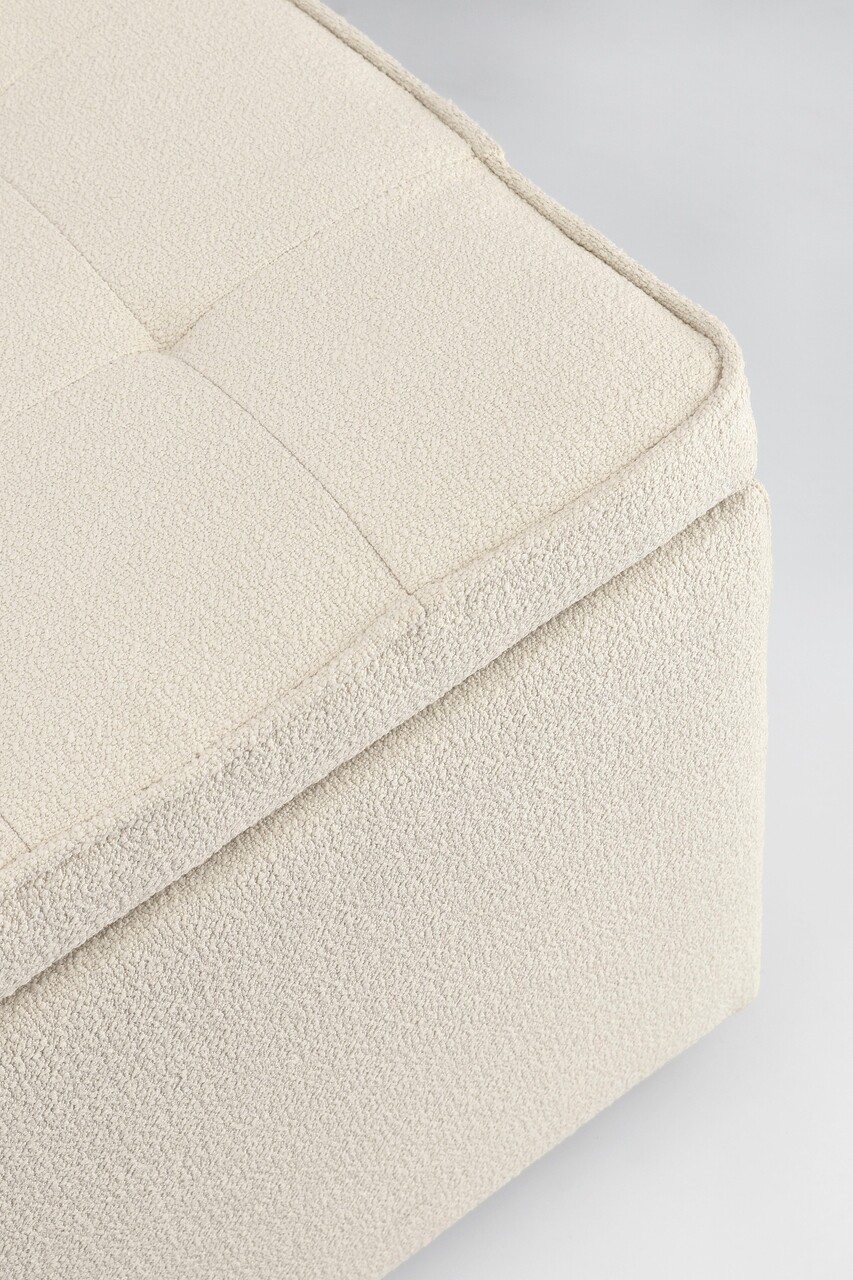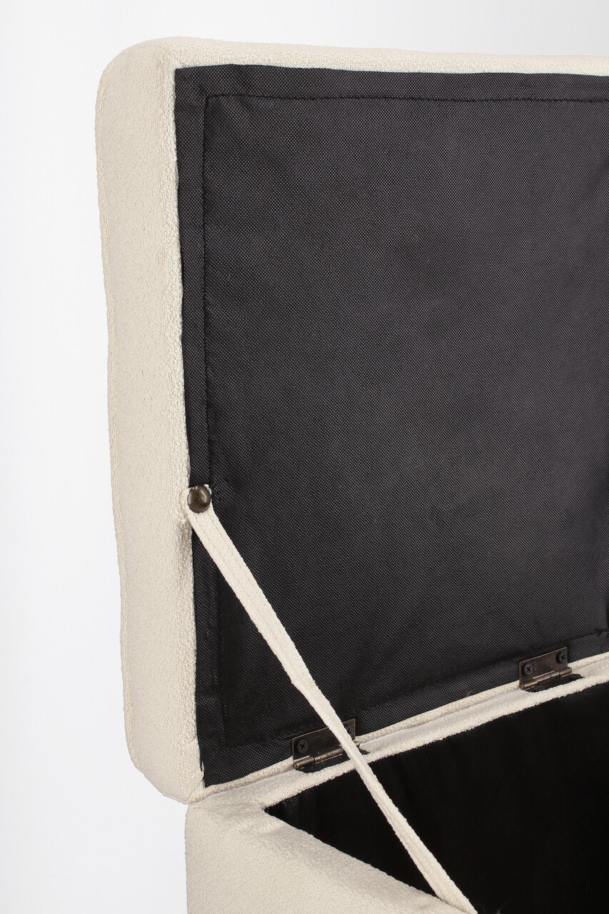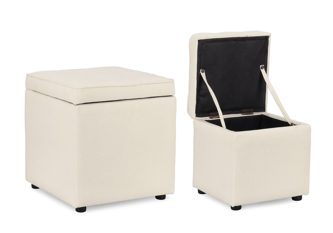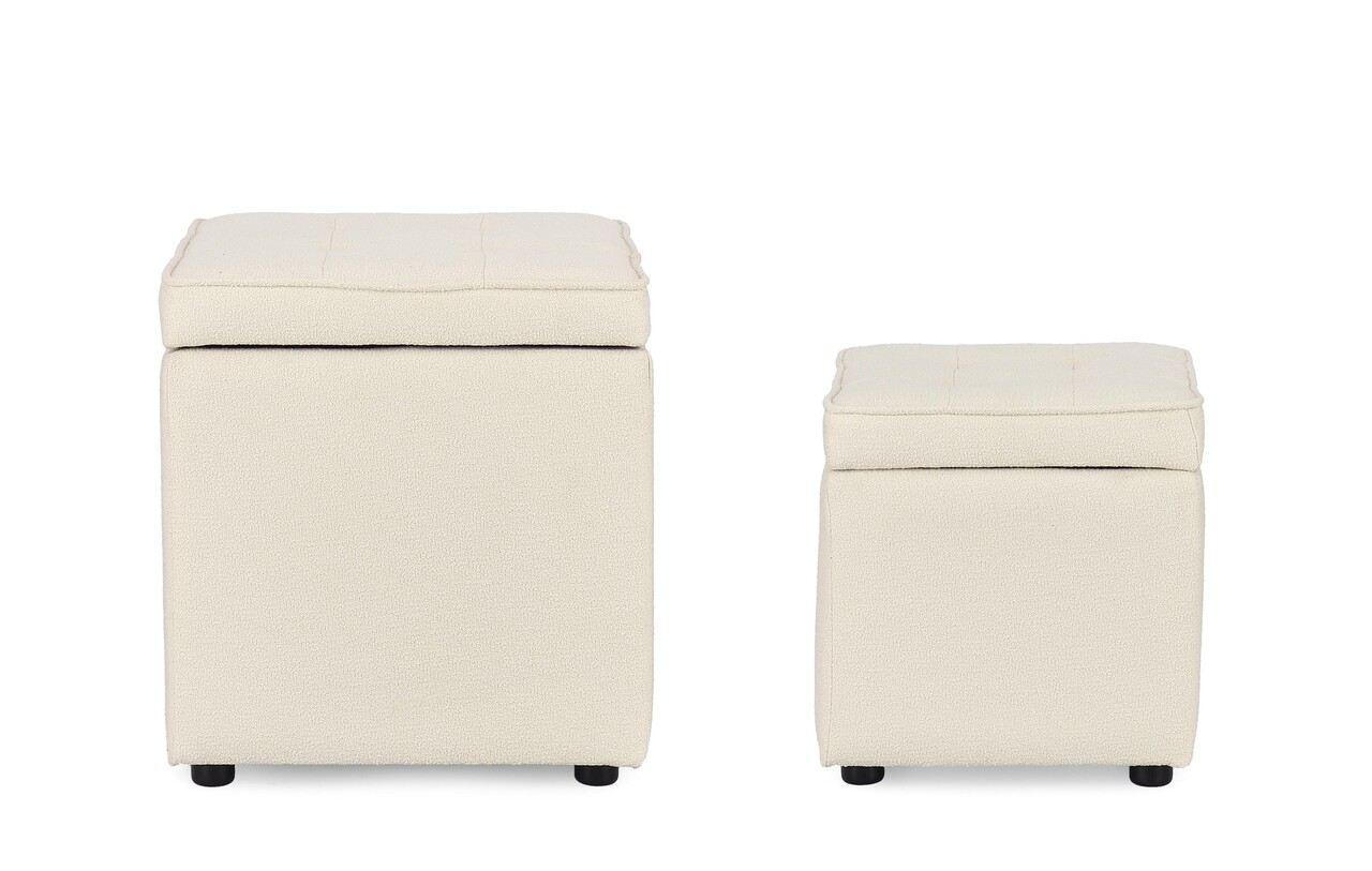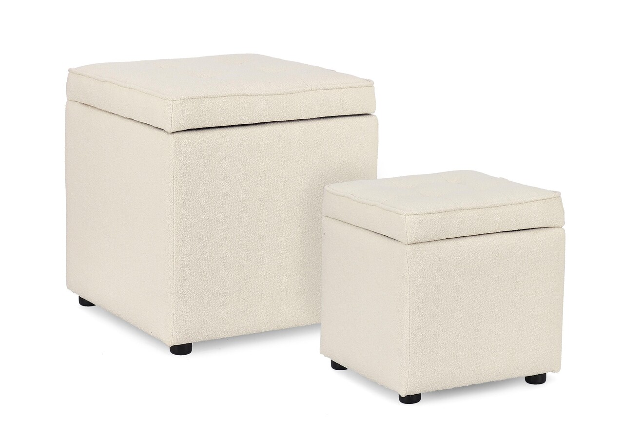 Set 2 taburete cu spatiu de depozitare Derrick, Bizzotto, 35x35x35 cm/45x45x45 cm, lemn de pin/poliester Boucle, alb