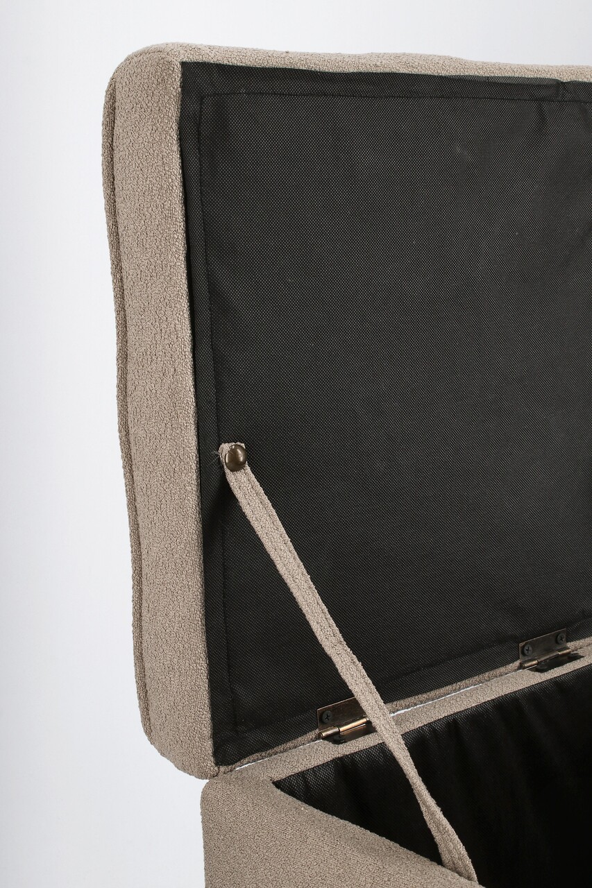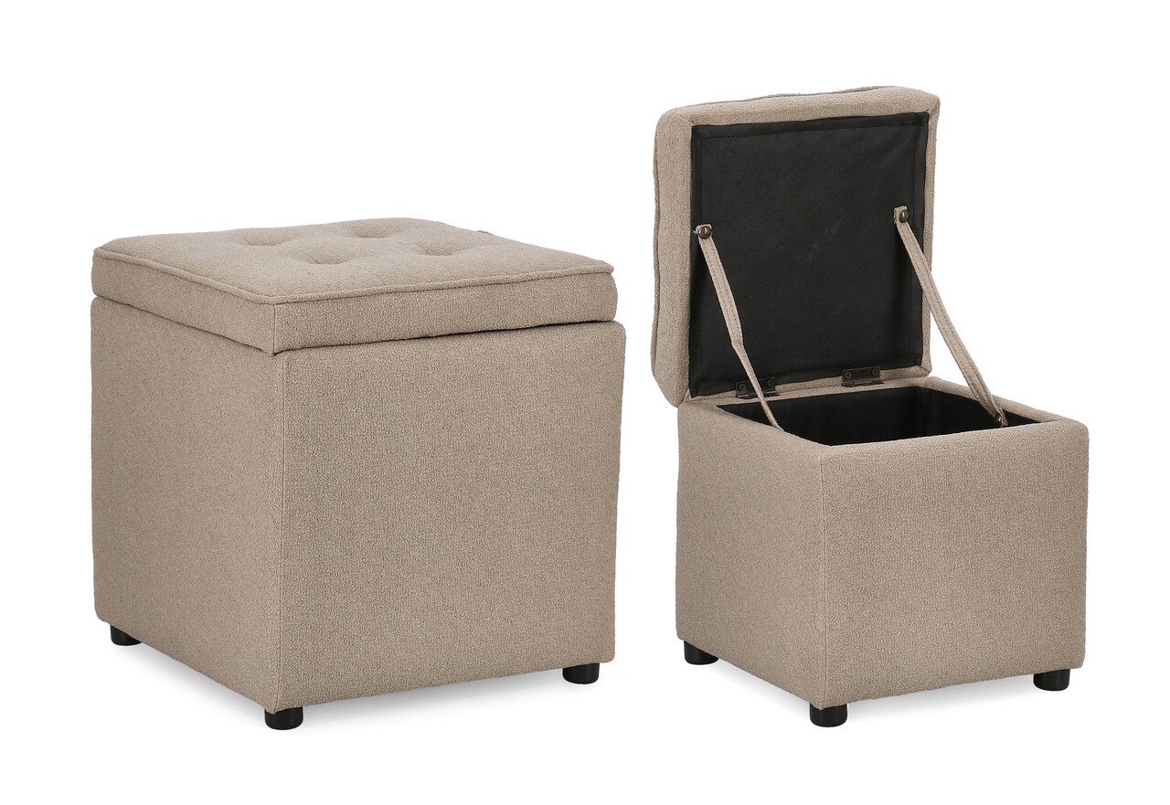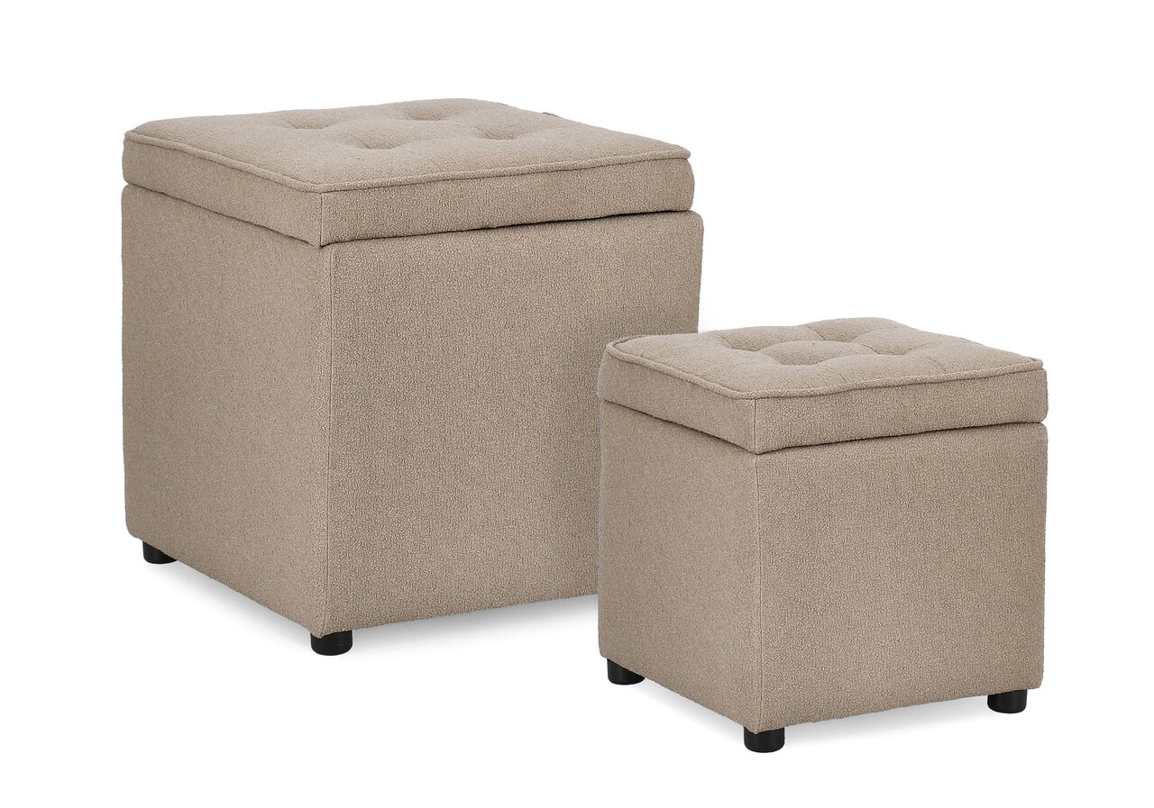 Set 2 taburete cu spatiu de depozitare Derrick, Bizzotto, 35x35x35 cm/45x45x45 cm, lemn de pin/poliester Boucle, grej