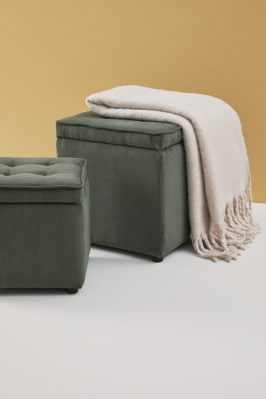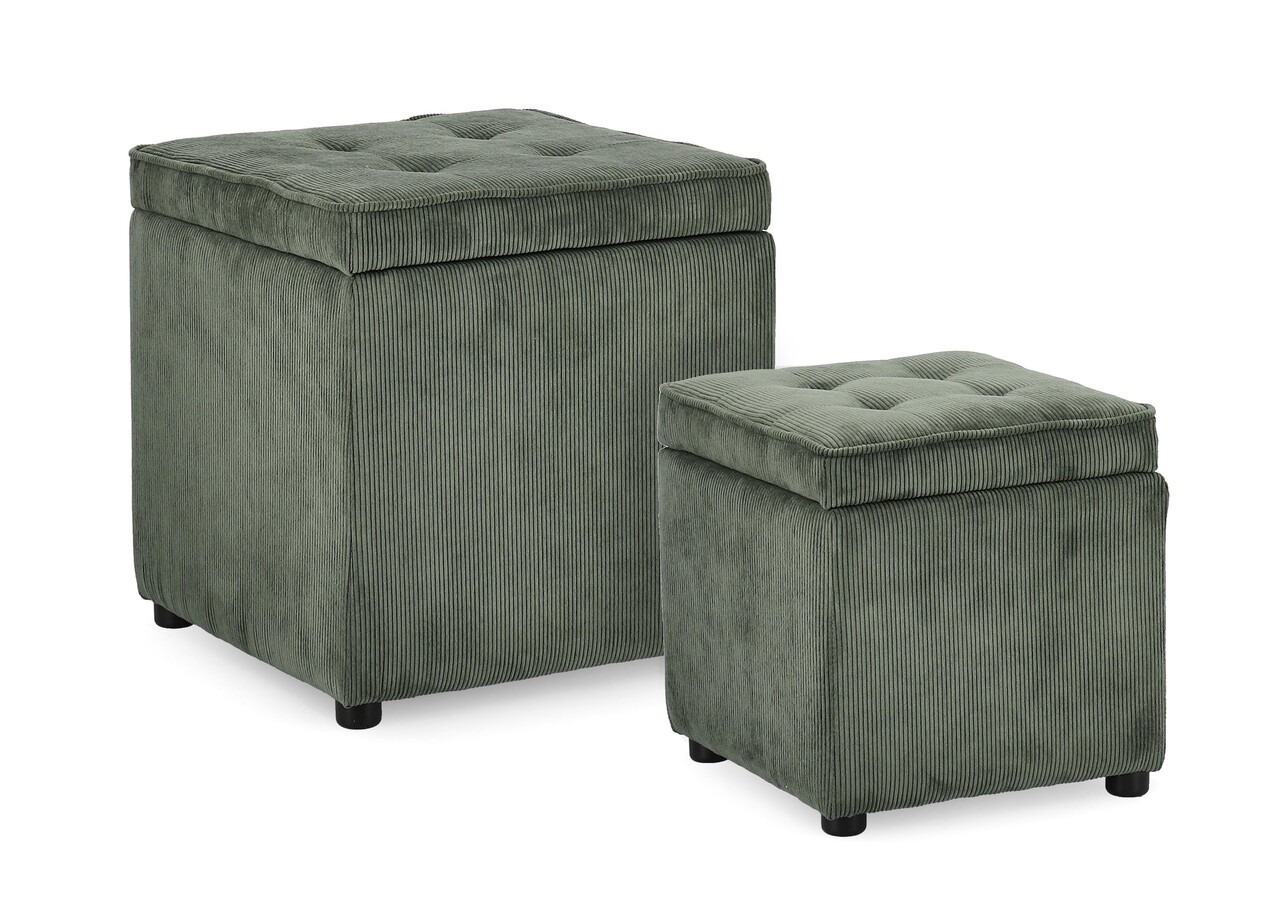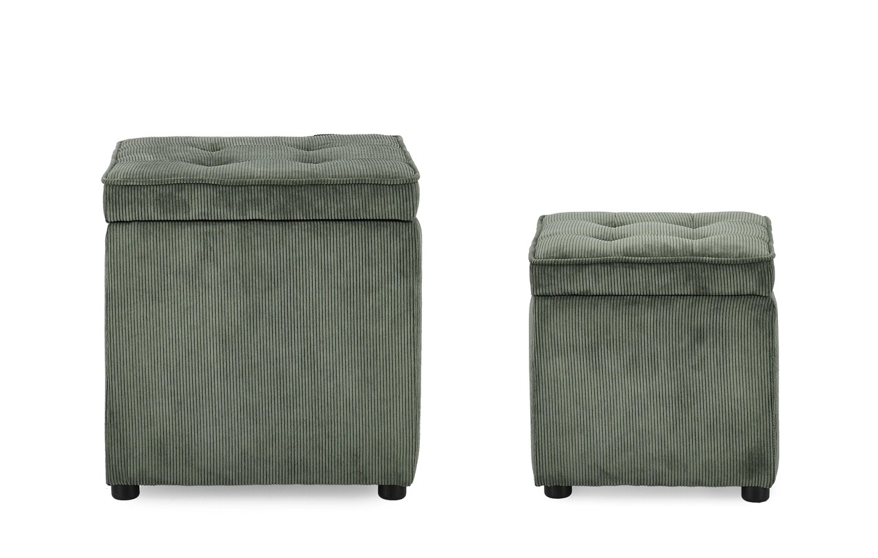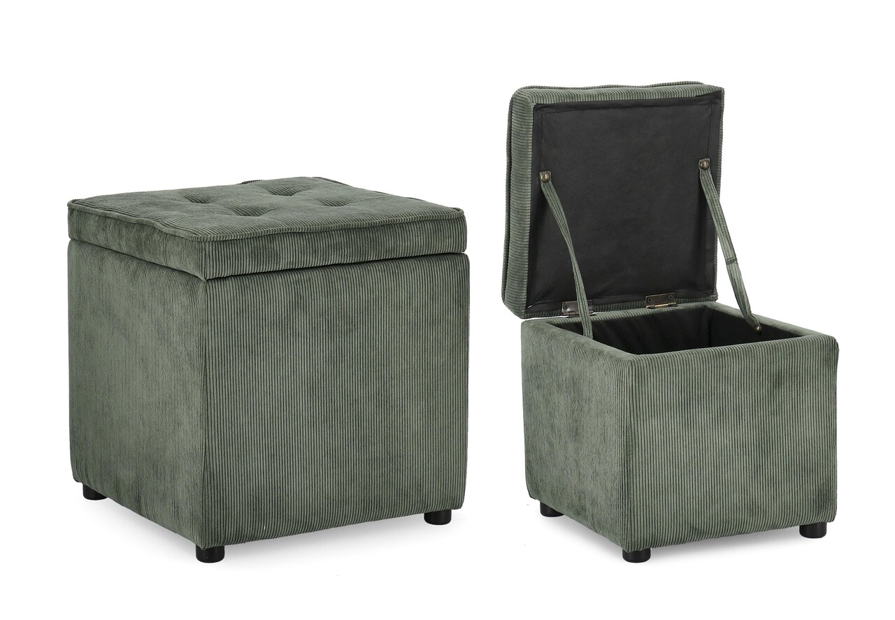 Set 2 taburete cu spatiu de depozitare Dylan, Bizzotto, 35x35x35 cm/45x45x45 cm, velur din poliester/lemn de pin, verde