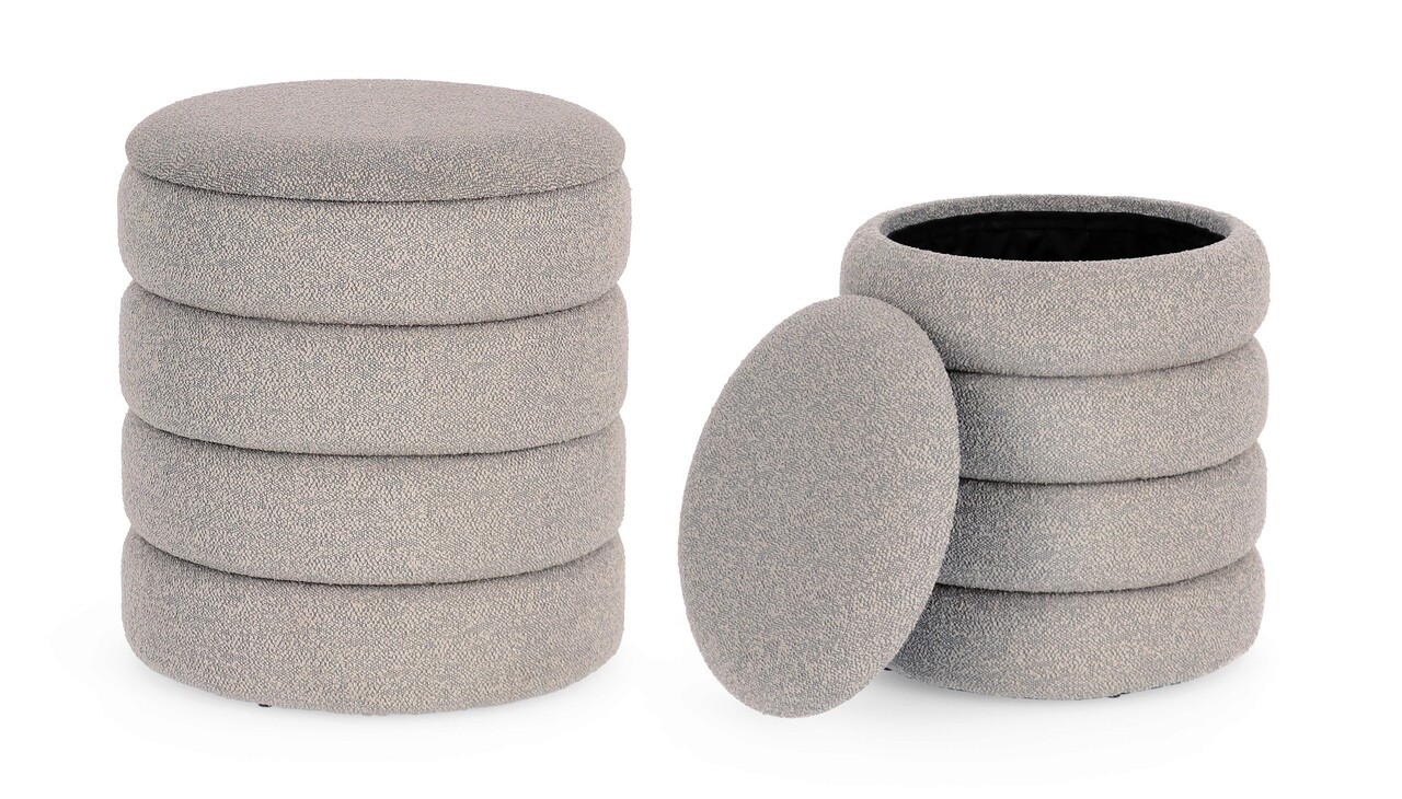 Set 2 taburete cu spatiu de depozitare Katerina, Bizzotto, Ø40 x 44.5 cm, MDF/poliester Boucle, gri deschis