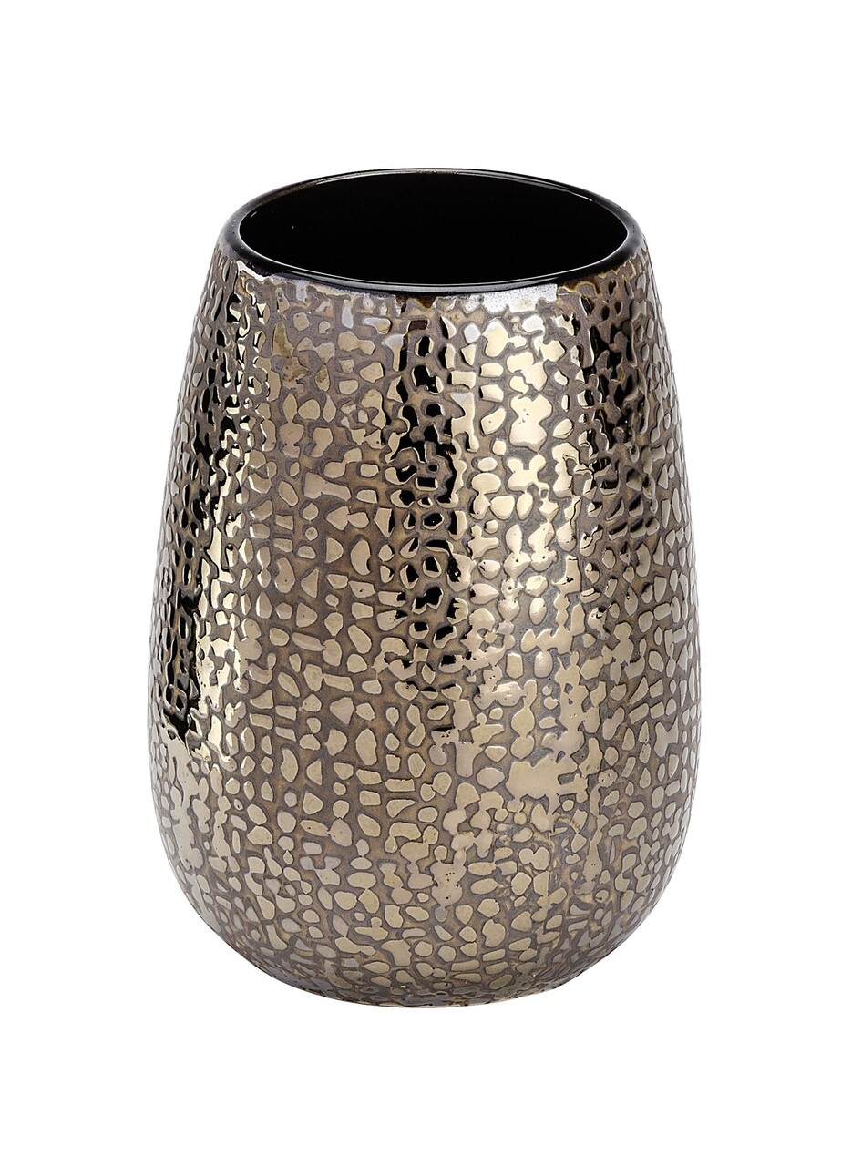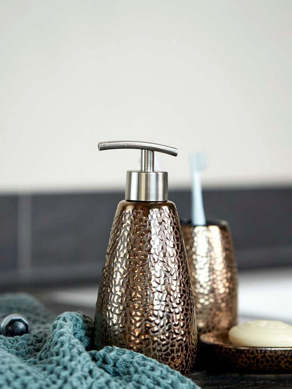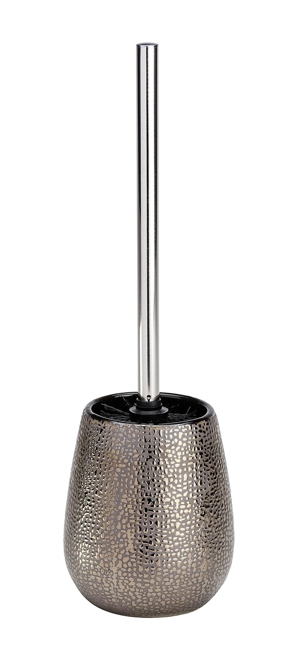Setul este format din suport pentru periute si pasta de dinti Ø 7.8 x 10.5 cm, dozator sapun lichid 210 ml, 8.5 x 17.5 x 6.5 cm si perie pentru toaleta cu suport Ø 10 x 37 cm.