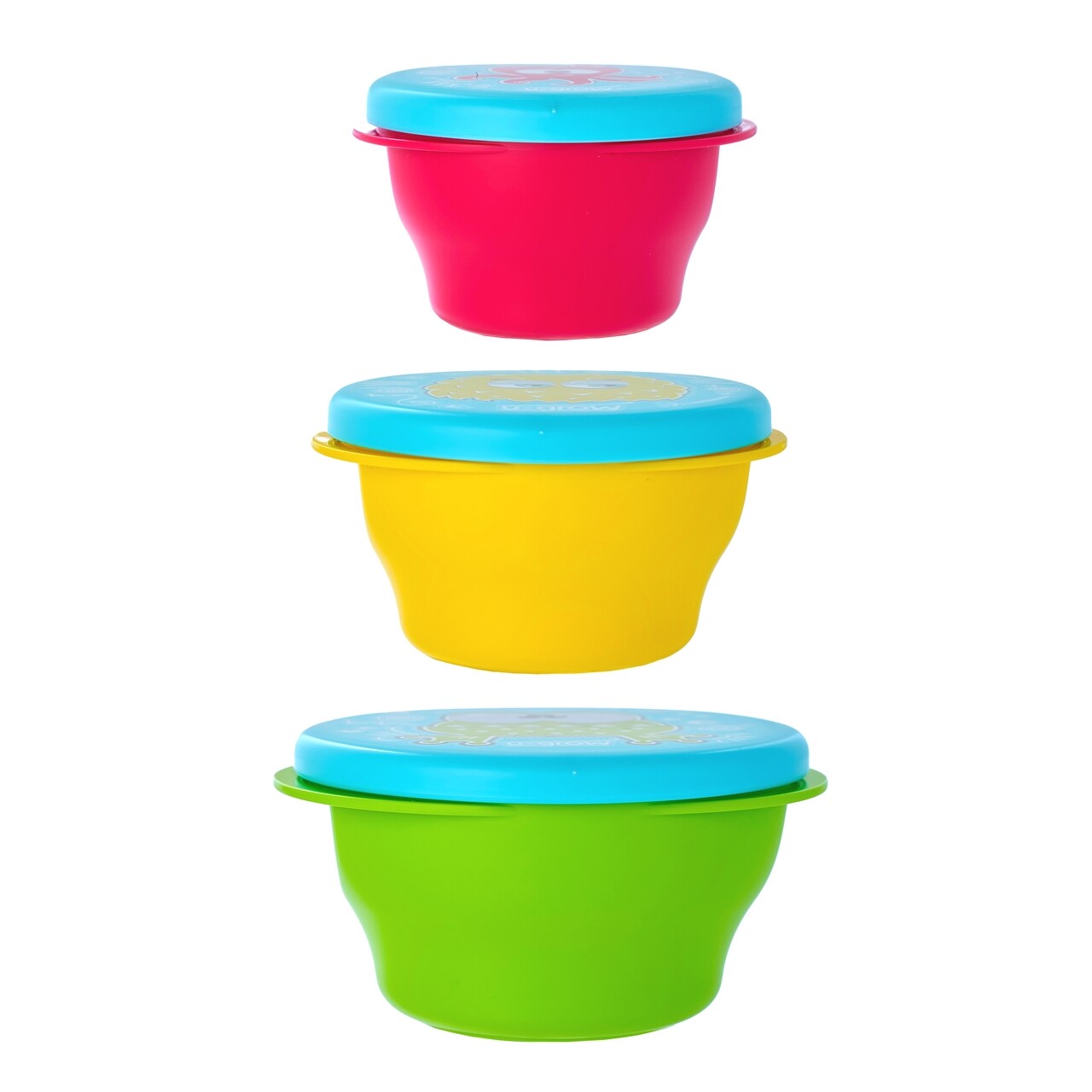 Setul este format din trei boluri cu capacitati diferite, de 160 ml, 240 ml si 340 ml. Designul este unul foarte simpatic si permite deschiderea cu usurinta a capacelor.
