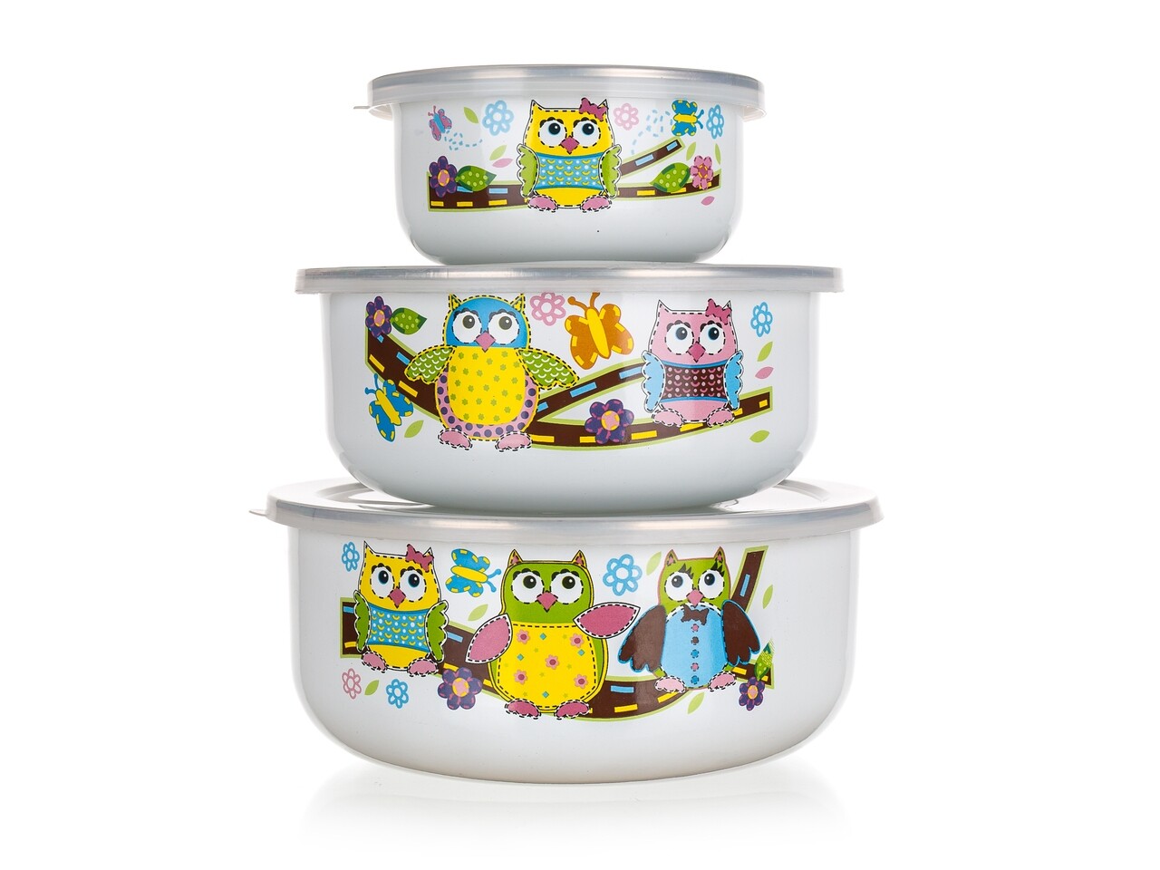Set 3 boluri emailate cu capac din plastic Owl, Banquet