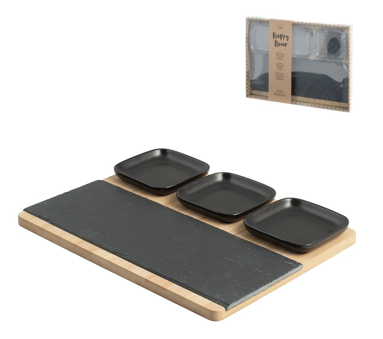 Set 3 boluri si platou pentru aperitive H&H, 26 x 20 cm, bambus/ardezie