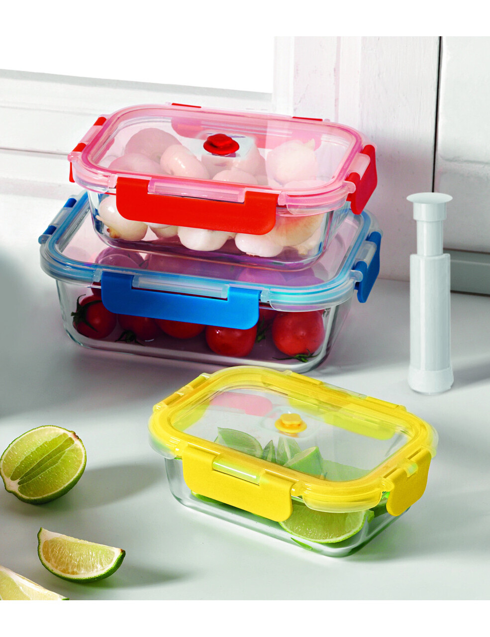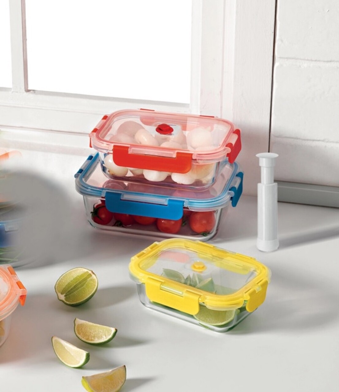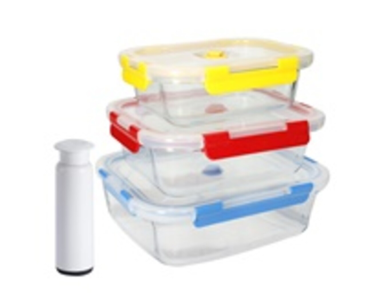 Setul de 3 recipiente din sticla borosilicata este ideal pentru o bucatarie moderna si eficienta. Rezistente la caldura si variatii termice, pot fi folosite in frigider, congelator, cuptor si cuptor cu microunde (fara capac). Capacele etanse si pompa manuala pentru vidat contribuie la o pastrare mai indelungata a alimentelor, reducand risipa si organizand spatiul eficient.